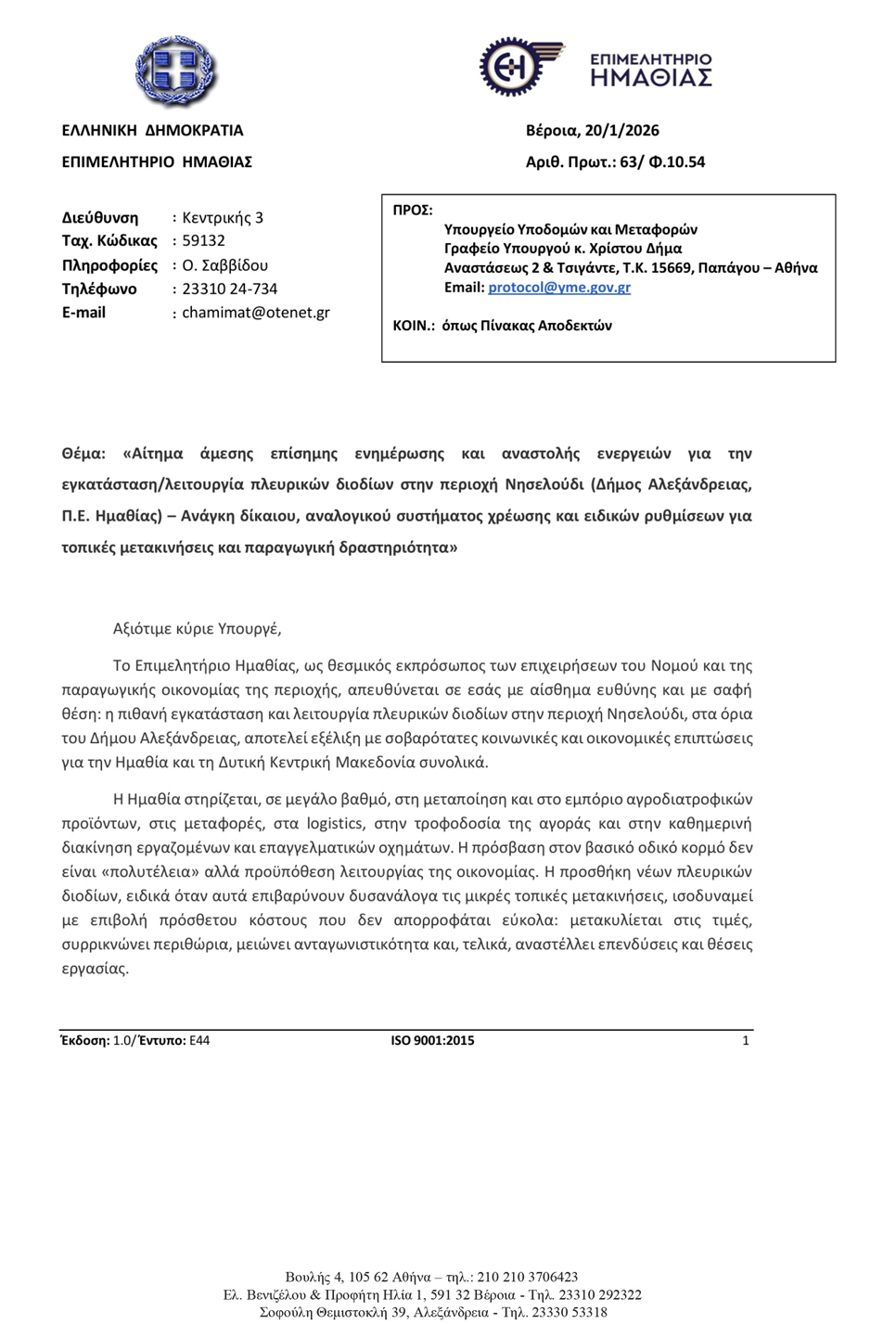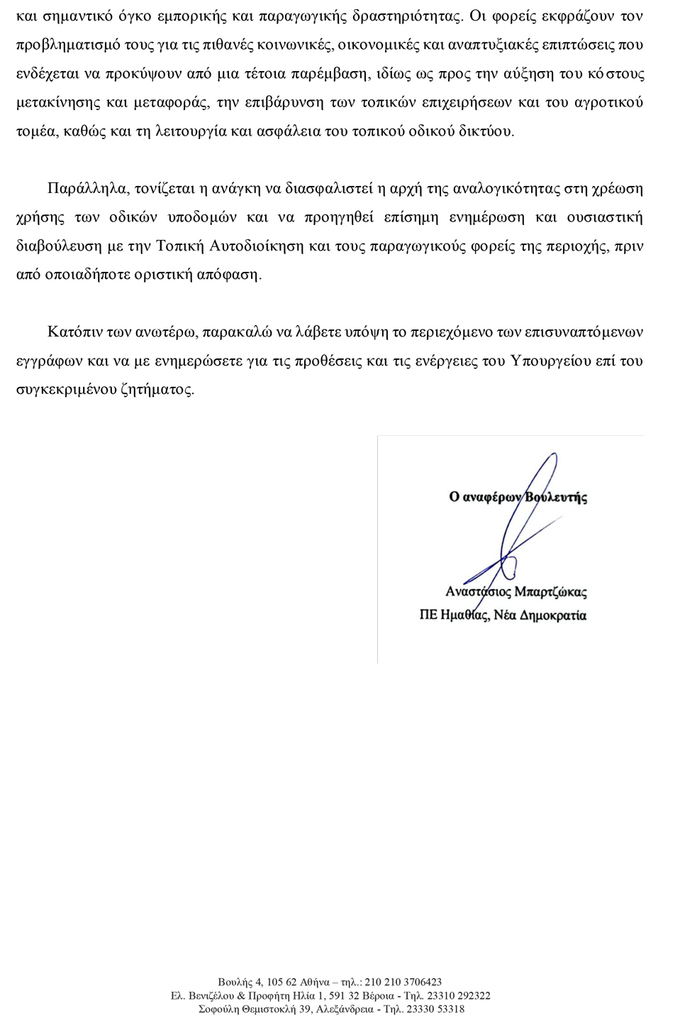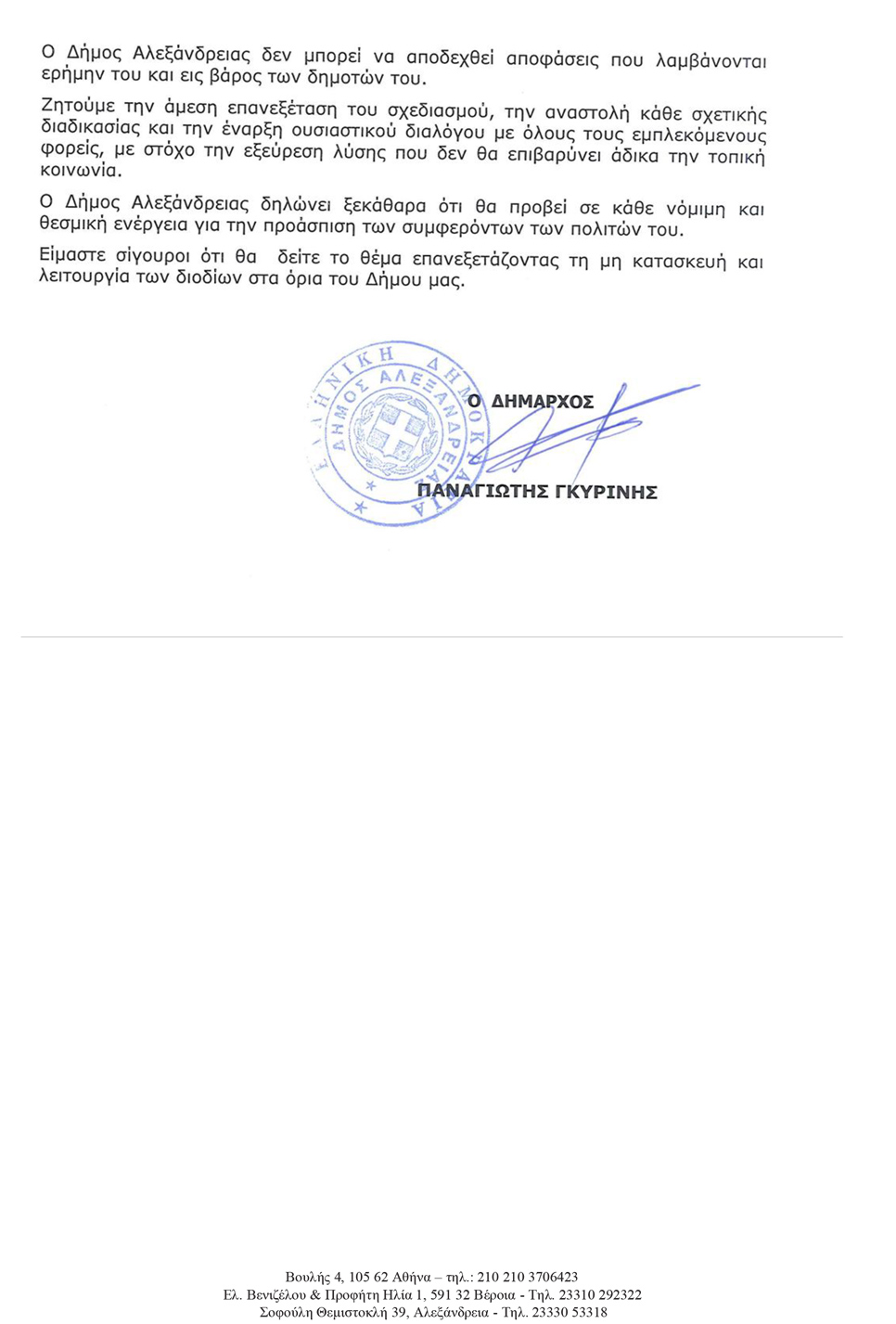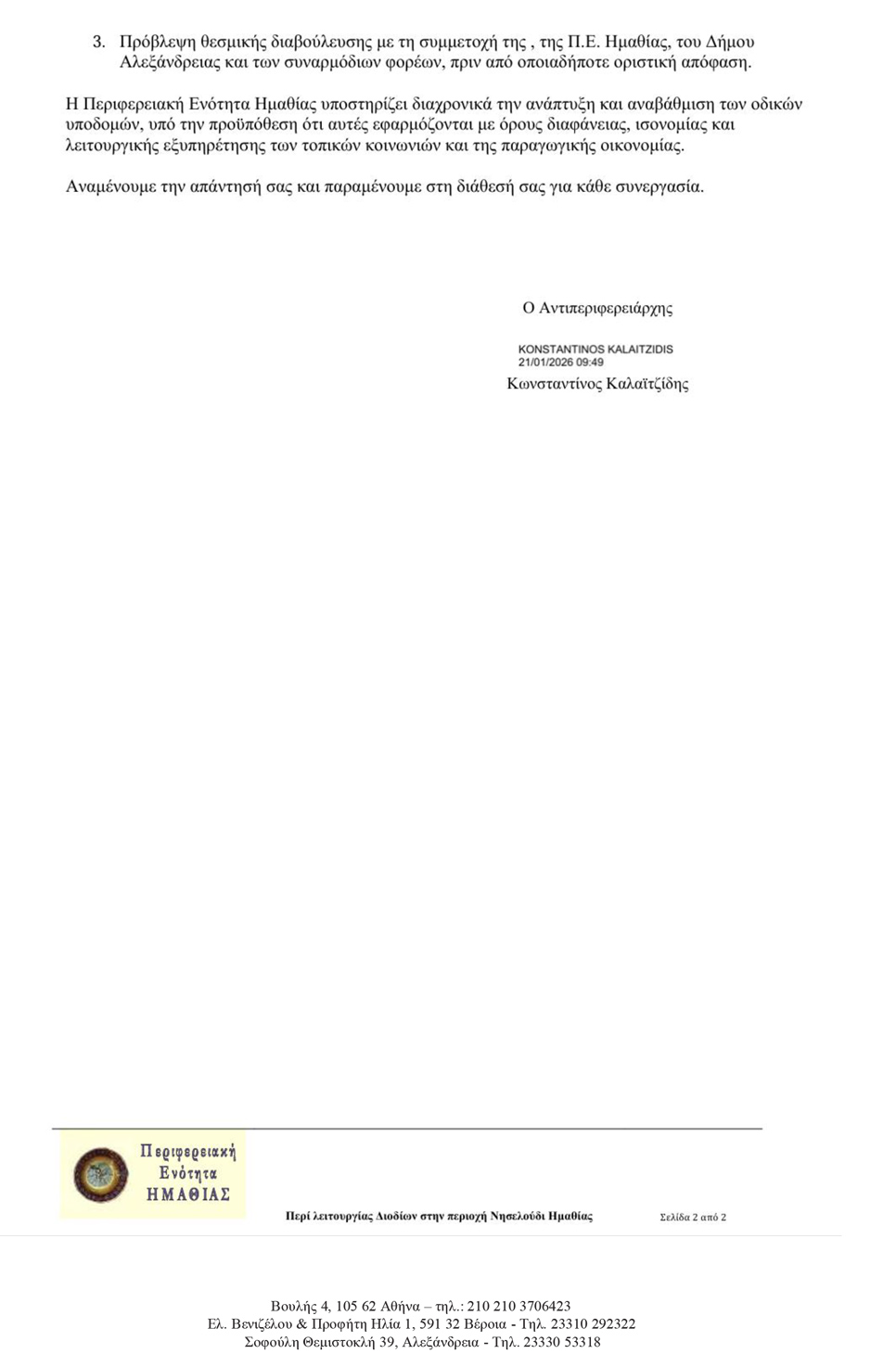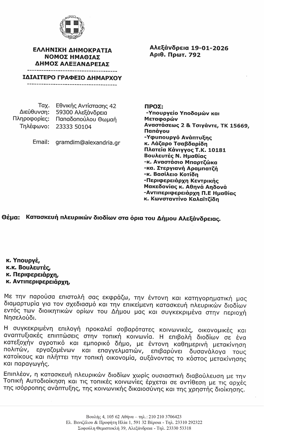 Συγκεκριμένα, ο Τάσος Μπαρτζώκας κατέθεσε ως Αναφορά τις επιστολές της Περιφερειακής Ενότητας Ημαθίας, του Δήμου Αλεξάνδρειας και του Επιμελητηρίου Ημαθίας, με τις οποίες επισημαίνονται οι σοβαρές κοινωνικές, οικονομικές και αναπτυξιακές επιπτώσεις που ενδέχεται να προκύψουν από μια τέτοια παρέμβαση.