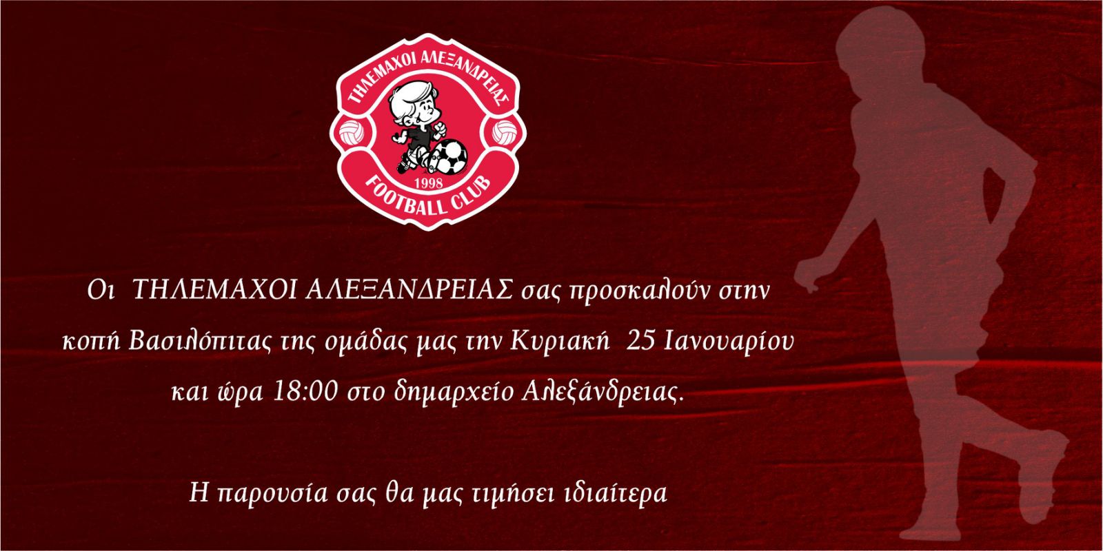 Την Κυριακή 25 Ιανουαρίου 2026 και ώρα 18:00 θα πραγματοποιηθεί η κοπή της πρωτοχρονιάτικης βασιλόπιτας των Τηλεμάχων Αλεξάνδρειας, στο δημαρχείο Αλεξάνδρειας.