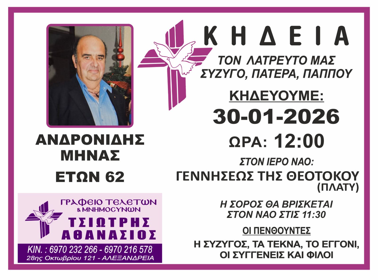 Η κηδεία του θα πραγματοποιηθεί την Παρασκευή 30 Ιανουαρίου 2026 στις 12:00 στον Ιερό Ναό Γεννήσεως Θεοτόκου στο Πλατύ του δήμου Αλεξάνδρειας.