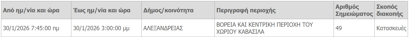 Προγραμματισμένη διακοπή ρεύματος λόγω κατασκευών θα πραγματοποιήσει την Παρασκευή 30 Ιανουαρίου 2026 ο ΔΕΔΔΗΕ στον δήμο Αλεξάνδρειας.