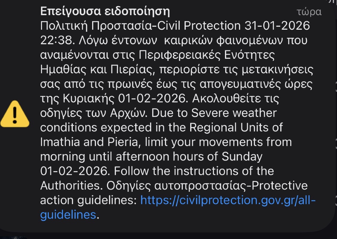 Ήχησε το sms του της Πολιτικής προστασίας στα κινητά και της Αλεξάνδρειας το βράδυ του Σαββάτου 31 Ιανουαρίου 2026.