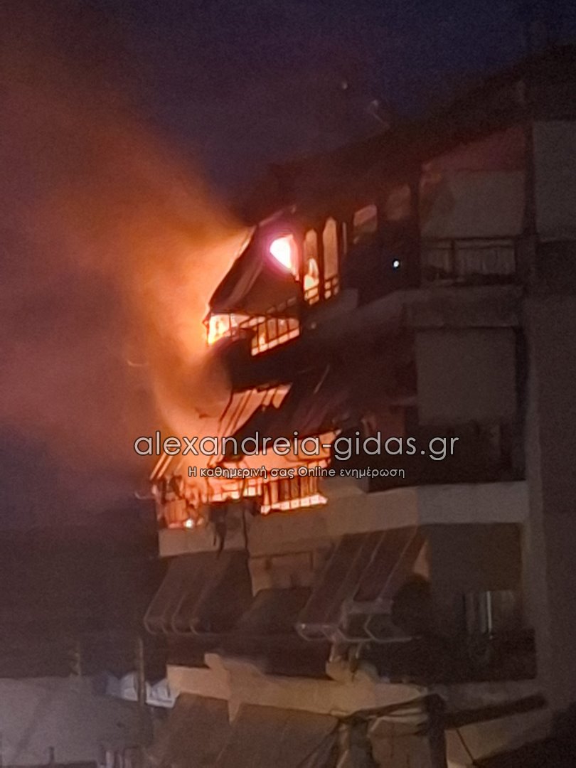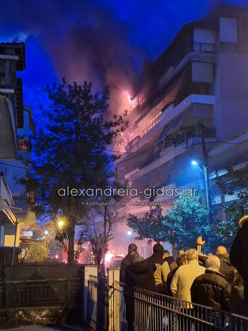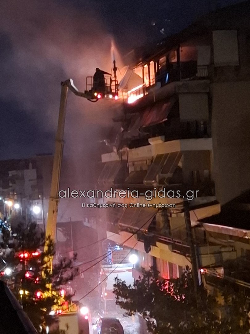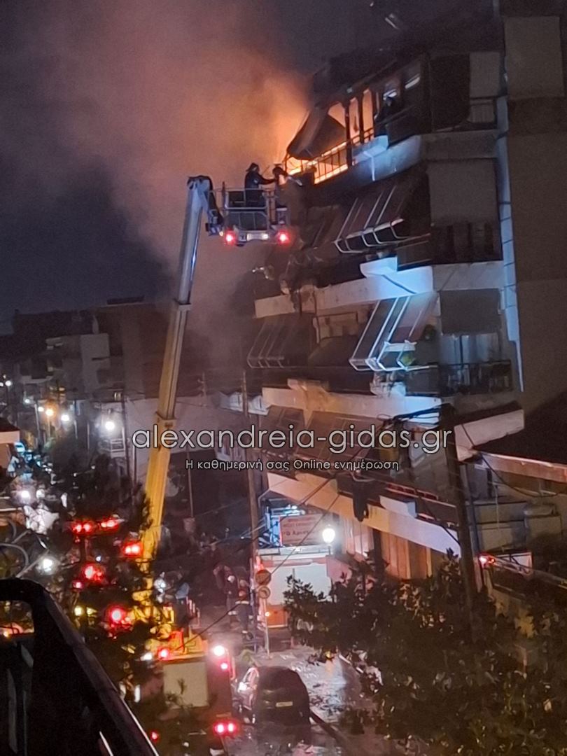 Μεγάλη καταστροφή από φωτιά υπέστησαν διαμερίσματα πολυκατοικίας στην Αλεξάνδρεια το βράδυ του Σαββάτου 31 Ιανουαρίου 2026.