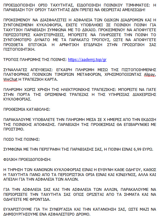 Με νέο μήνυμα SMS που αποστέλλεται σε κινητά τηλέφωνα, επιτήδειοι προσπαθούν να εξαπατήσουν τους πολίτες μέσω ψευδών ειδοποιήσεων περί δήθεν επιβολής «ποινής» ή «προστίμου» για υπέρβαση ορίου ταχύτητας.