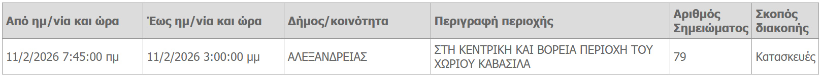 Προγραμματισμένη διακοπή ρεύματος λόγω κατασκευών θα πραγματοποιήσει την Τετάρτη 11 Φεβρουαρίου 2026 ο ΔΕΔΔΗΕ στον δήμο Αλεξάνδρειας.