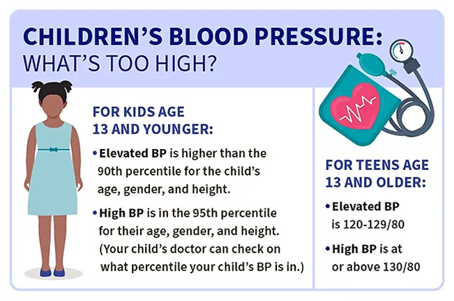 Γενικά, για παιδιά 1–13 ετών, υπέρταση ορίζεται όταν οι μετρήσεις σε ≥3 επισκέψεις είναι ≥95η εκατοστιαία θέση ή ≥130/80 mmHg (όποιο είναι χαμηλότερο).