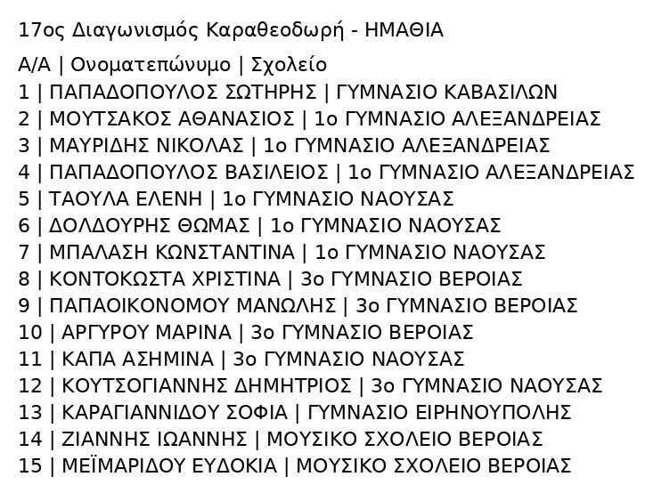 Η Διοικούσα Επιτροπή του Παραρτήματος Ημαθίας της Ελληνικής Μαθηματικής Εταιρείας ανακοινώνει τους επιτυχόντες του 17ου Ημαθιώτικου Μαθηματικού Διαγωνισμού «Κ. Καραθεοδωρή» για μαθητές της Α΄ Γυμνασίου, ο οποίος διεξήχθη το Σάββατο 17 Ιανουαρίου 2026.