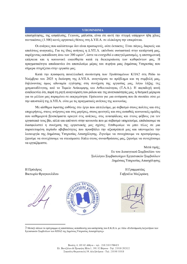 Όπως αναφέρεται στο υπόμνημα, σήμερα υπηρετούν περισσότεροι από 700 Εργασιακοί Σύμβουλοι πανελλαδικά, ενώ καταγράφονται περίπου 1.500 κενές οργανικές θέσεις στη Δ.ΥΠ.Α. Παράλληλα, οι συγκεκριμένοι εργαζόμενοι καλύπτουν πάγιες και διαρκείς ανάγκες, συμβάλλοντας καθοριστικά στην εφαρμογή των ενεργών πολιτικών απασχόλησης.