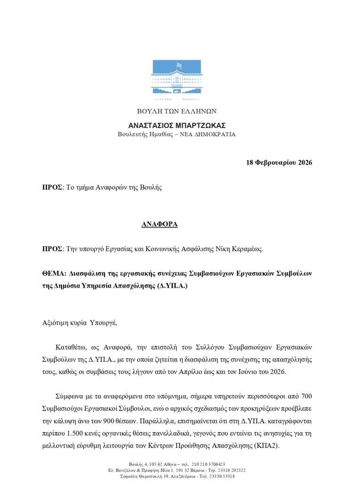 Συγκεκριμένα, ο Τάσος Μπαρτζώκας κατέθεσε ως Αναφορά την επιστολή του Συλλόγου Συμβασιούχων Εργασιακών Συμβούλων, με την οποία επισημαίνεται ότι οι συμβάσεις τους λήγουν από τον Απρίλιο έως και τον Ιούνιο του 2026, χωρίς να υπάρχει μέχρι στιγμής θεσμική πρόβλεψη για τη συνέχισή τους.