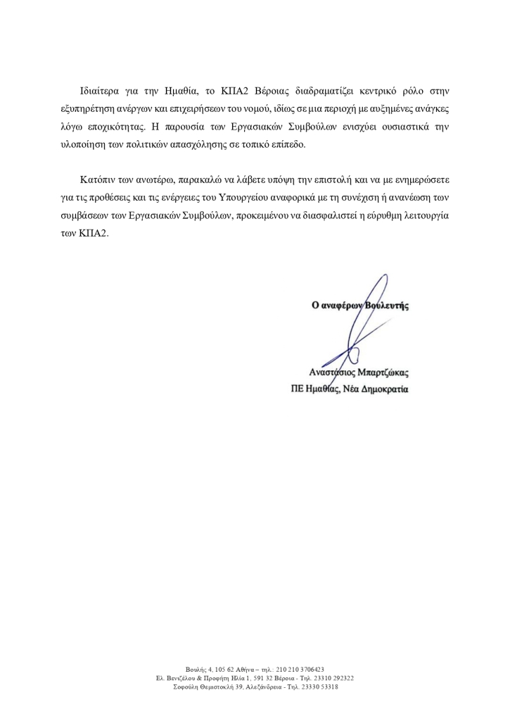 Ιδιαίτερη σημασία έχει το ζήτημα και για την Ημαθία, καθώς το ΚΠΑ2 Βέροιας διαδραματίζει κεντρικό ρόλο στην εξυπηρέτηση ανέργων και επιχειρήσεων σε Βέροια, Νάουσα και Αλεξάνδρεια, σε μια περιοχή με έντονη εποχικότητα στην αγορά εργασίας. Η παρουσία των Εργασιακών Συμβούλων ενισχύει ουσιαστικά τη στήριξη της τοπικής απασχόλησης και της επιχειρηματικότητας.