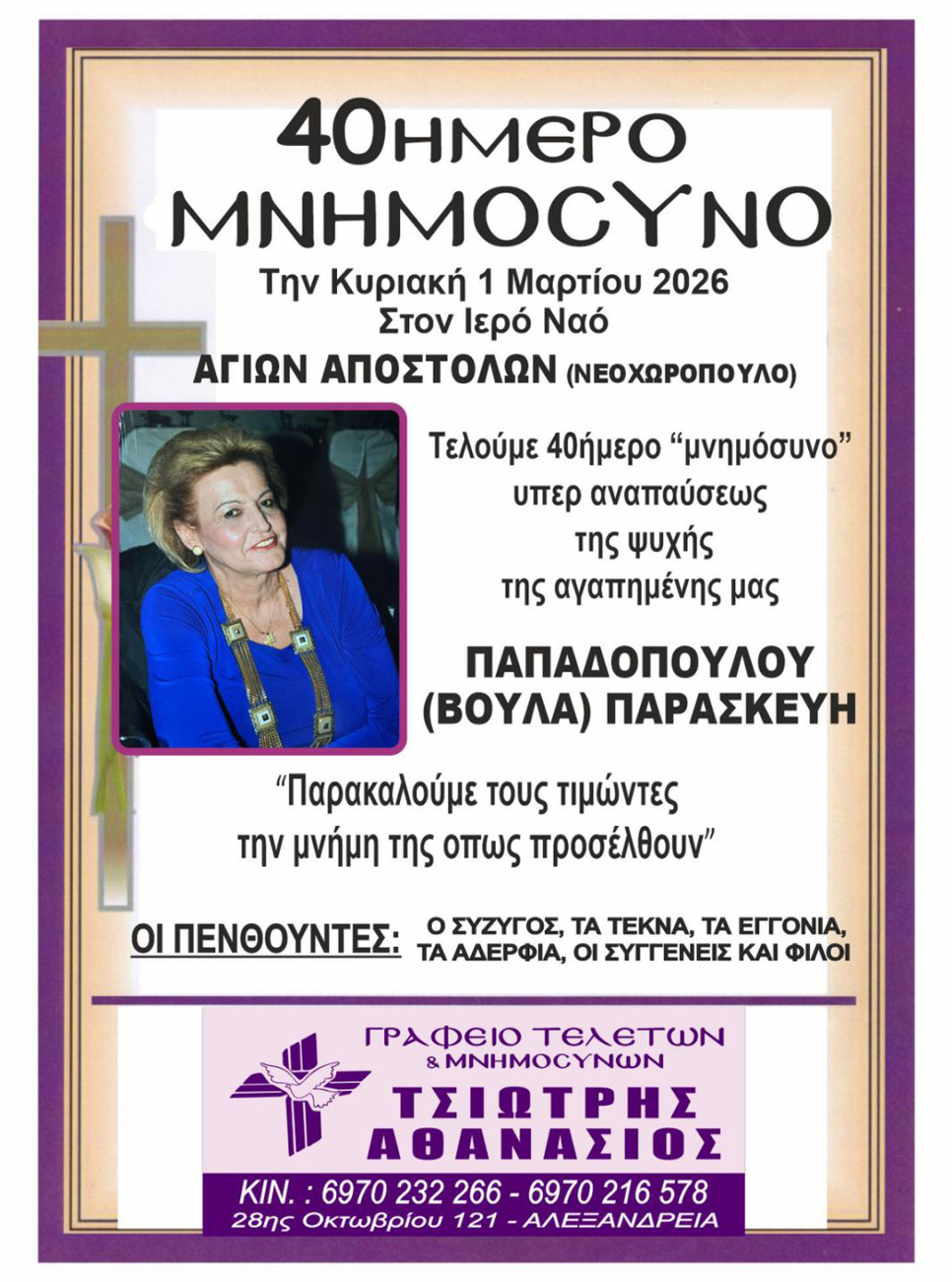 Την Κυριακή 1 Μαρτίου 2026 θα τελεστεί το 40ήμερο μνημόσυνο υπέρ αναπαύσεως της ψυχής της Παρασκευής (Βούλας) Παπαδοπούλου.