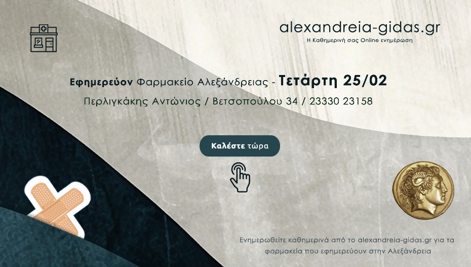 ΦΑΡΜΑΚΕΙΑ 25 Φεβρουαρίου, 2026 posted by admin Share Ποιο φαρμακείο εφημερεύει σήμερα Τετάρτη στην Αλεξάνδρεια 🔊 Ακούστε το άρθρο κάνοντας κλικ Αλεξάνδρεια: (κλικ στην εικόνα παρακάτω για να καλέσετε απευθείας το φαρμακείο) Αφήστε μια απάντηση Ακύρωση απάντησηςΗ ηλ. διεύθυνση σας δεν δημοσιεύεται. Τα υποχρεωτικά πεδία σημειώνονται με *Σχόλιο * Όνομα Email Ιστότοπος Αποθήκευσε το όνομά μου, email, και τον ιστότοπο μου σε αυτόν τον πλοηγό για την επόμενη φορά που θα σχολιάσω.