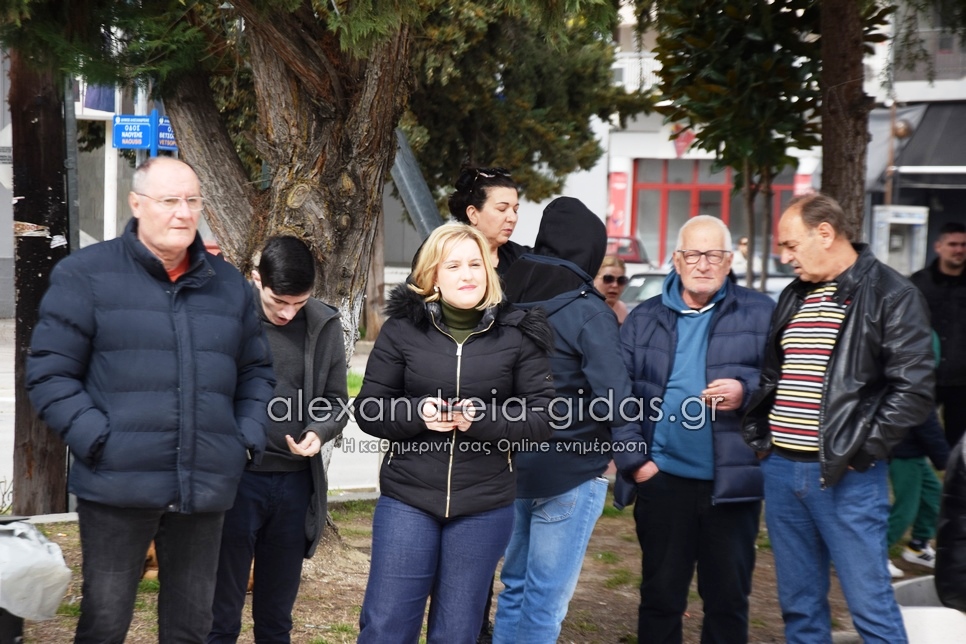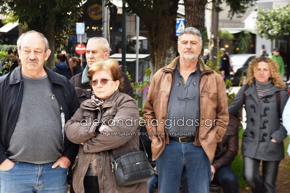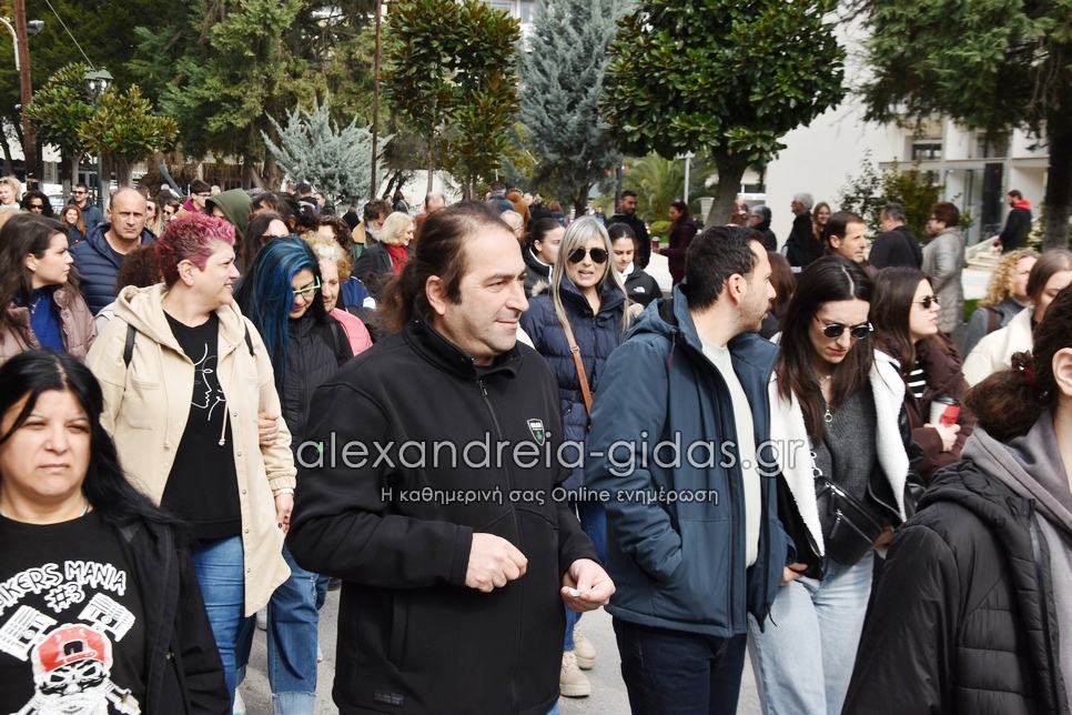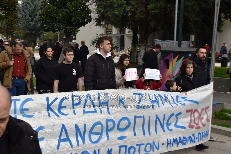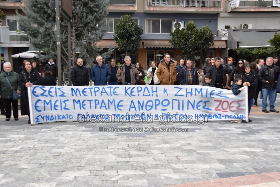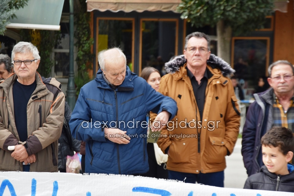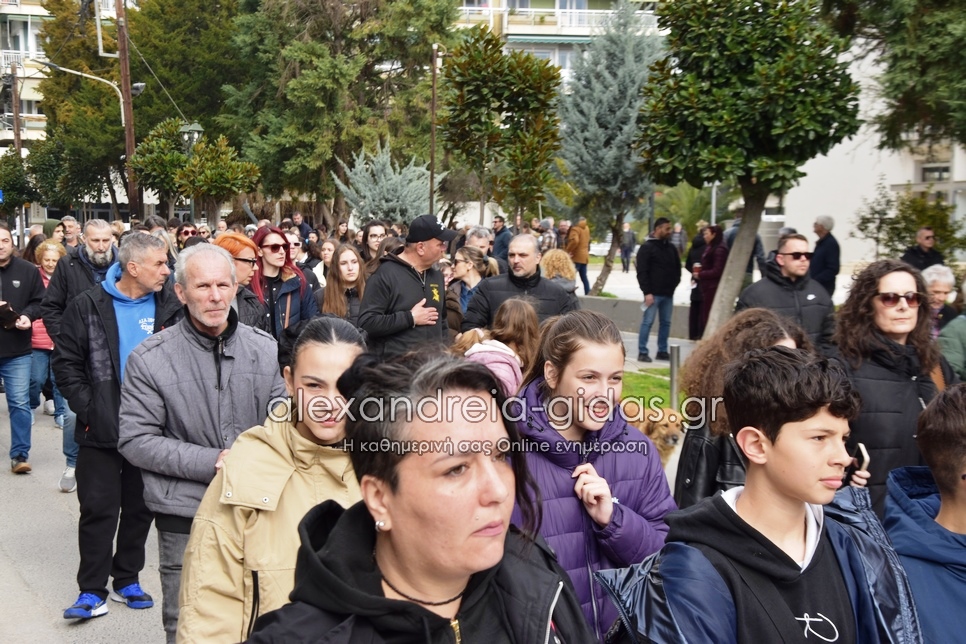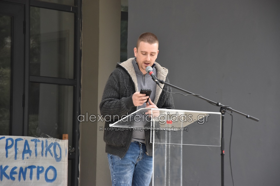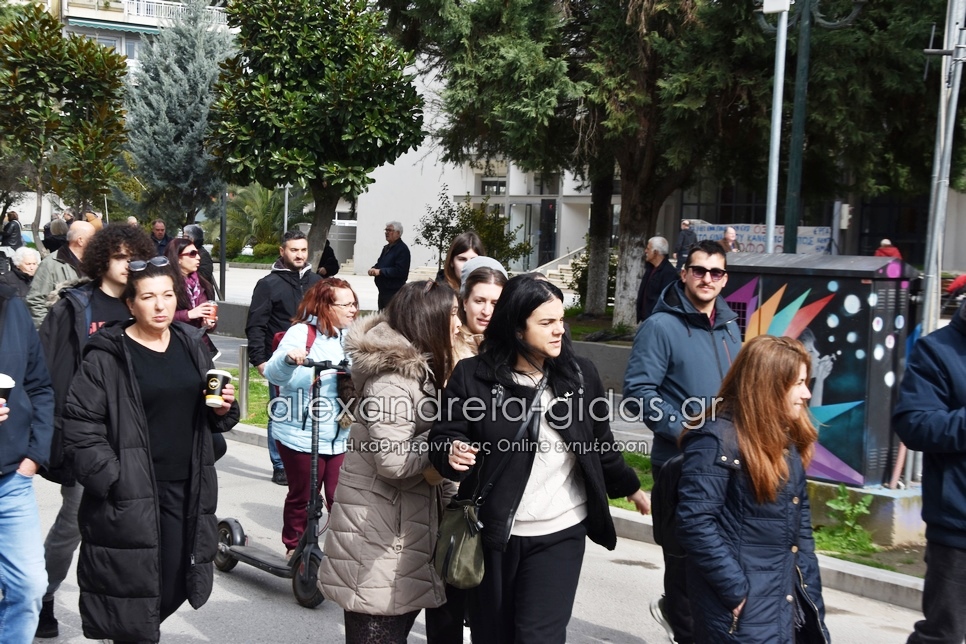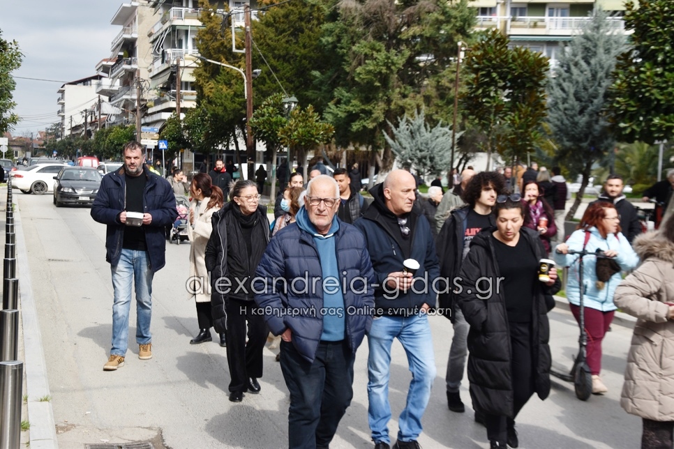 Η συγκέντρωση έγινε μπροστά στο Πνευματικό Κέντρο Αλεξάνδρειας και ακολούθησε πορεία μέχρι τον Σιδηροδρομικό Σταθμό.