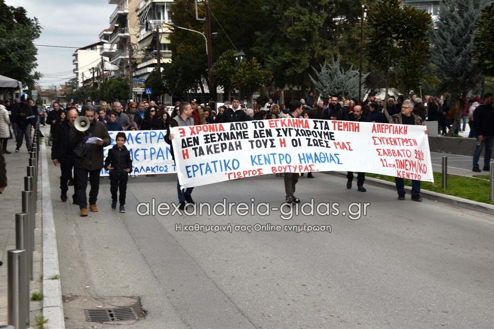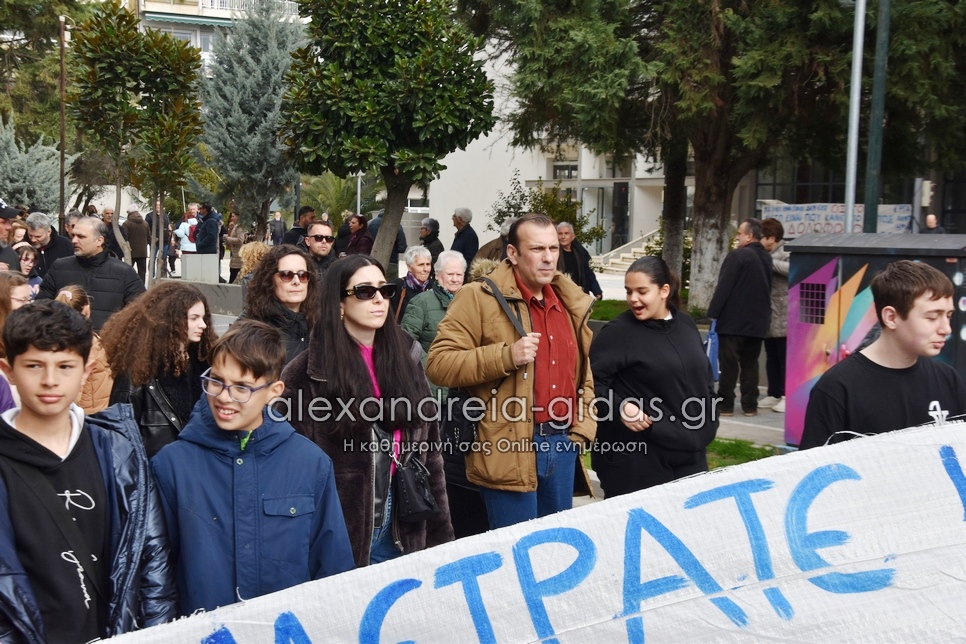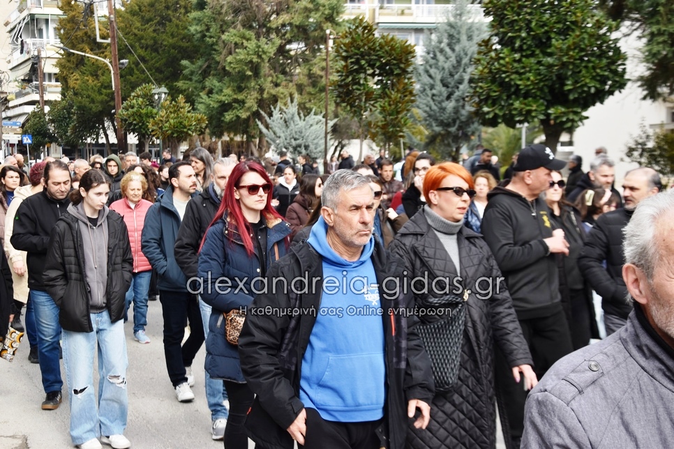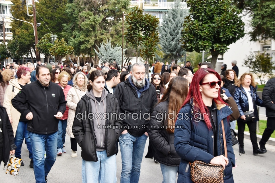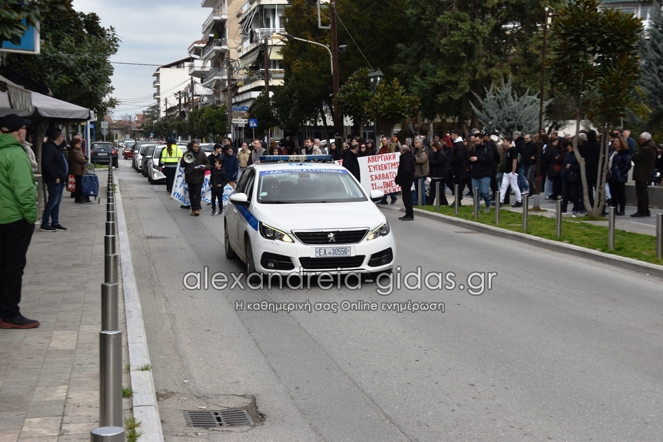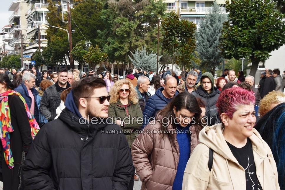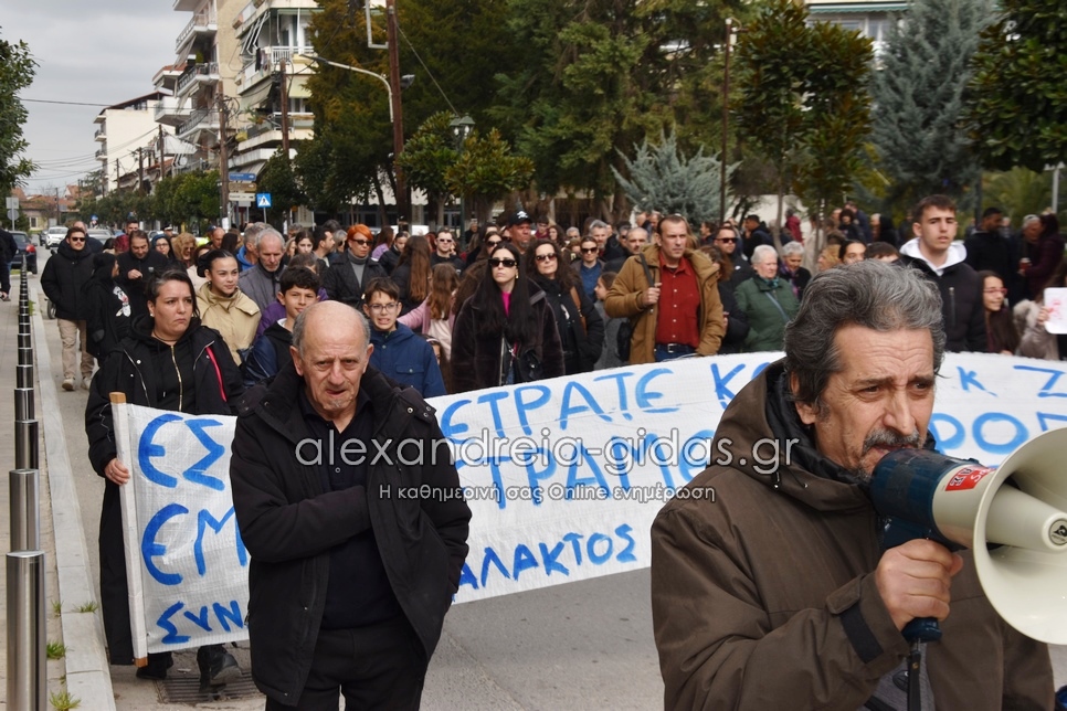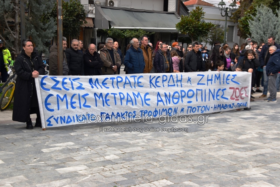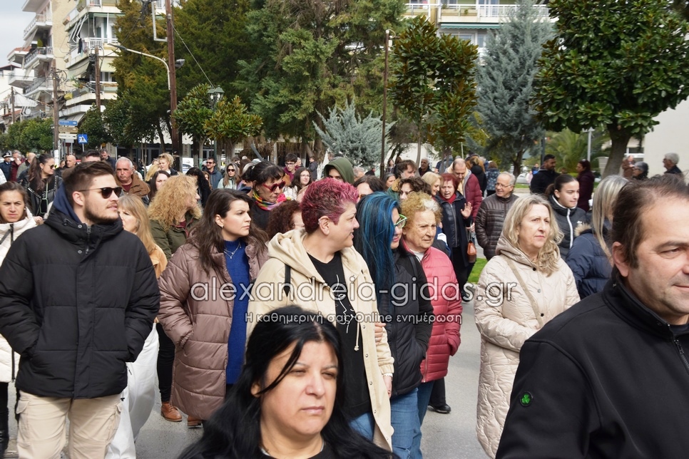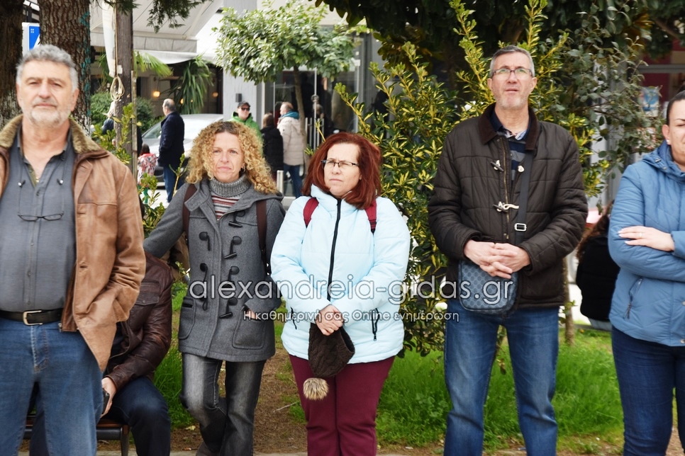 Η συγκέντρωση έγινε μπροστά στο Πνευματικό Κέντρο Αλεξάνδρειας και ακολούθησε πορεία μέχρι τον Σιδηροδρομικό Σταθμό.