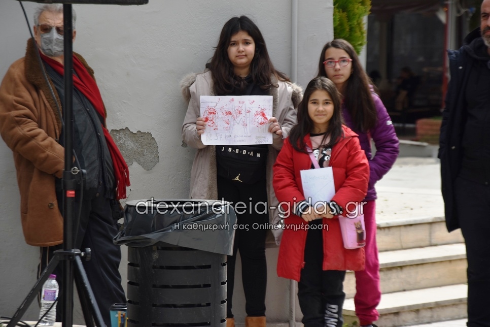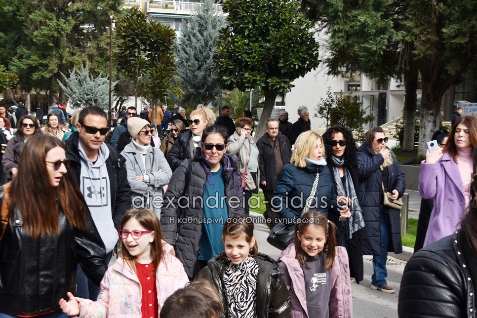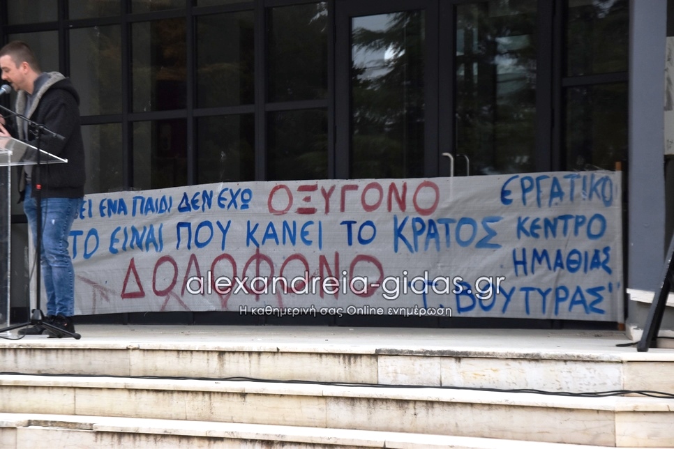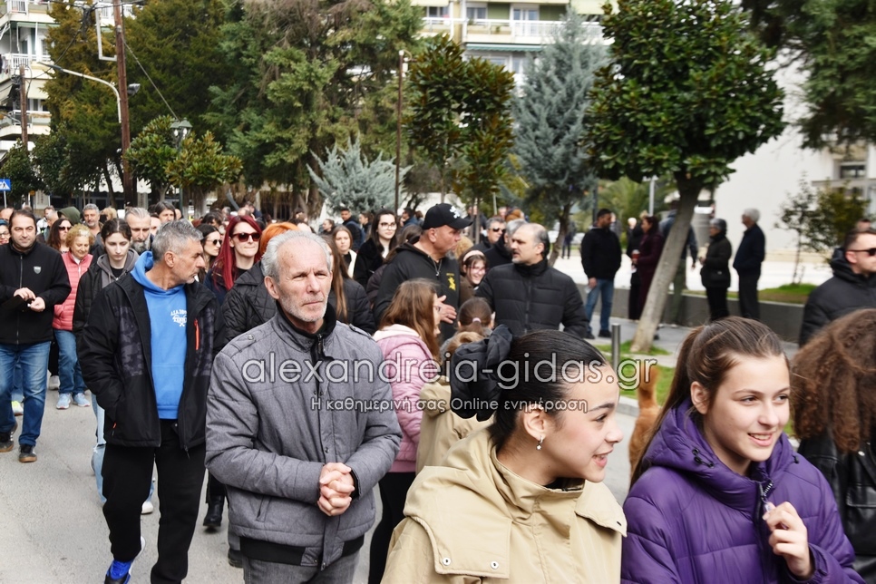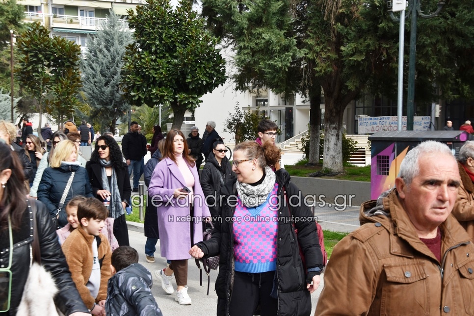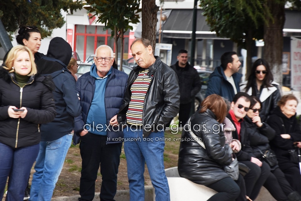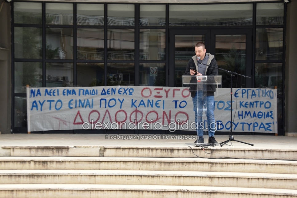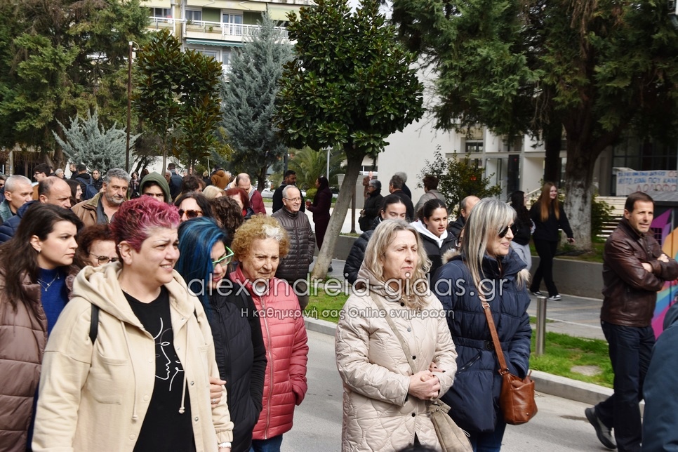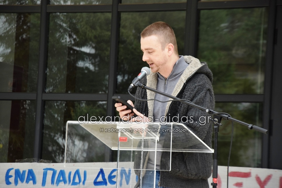 Η συγκέντρωση έγινε μπροστά στο Πνευματικό Κέντρο Αλεξάνδρειας και ακολούθησε πορεία μέχρι τον Σιδηροδρομικό Σταθμό.