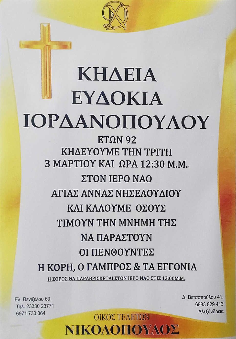 Η οικογένεια καλεί όσους τιμούν την μνήμη της, να παραστούν σήμερα Τρίτη 3 Μαρτίου 2026 στις 12:30 μ.μ. στον Ιερό Ναό Αγίας Άννας στο Νησελούδι του δήμου Αλεξάνδρειας.
