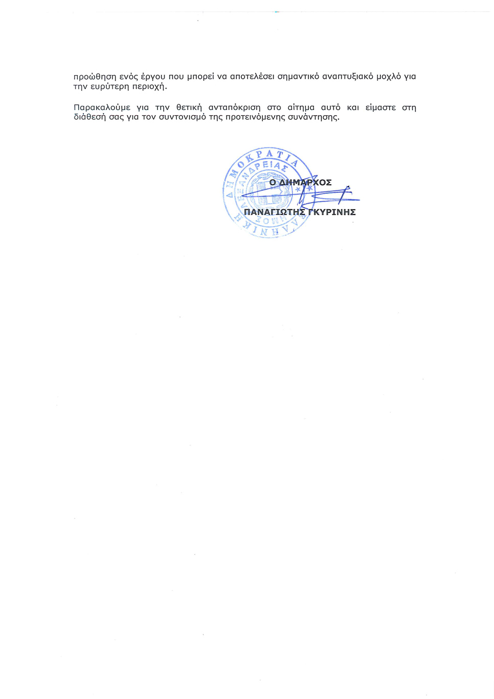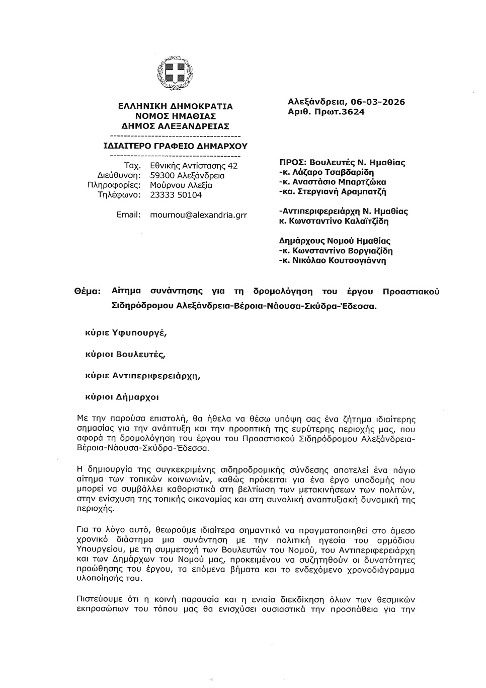 Ο Δήμαρχος Αλεξάνδρειας ζητά την πραγματοποίηση συνάντησης με τη συμμετοχή των βουλευτών, του Αντιπεριφερειάρχη και των Δημάρχων του νομού, προκειμένου να συζητηθούν οι δυνατότητες προώθησης του έργου, τα επόμενα βήματα καθώς και το πιθανό χρονοδιάγραμμα υλοποίησής του.