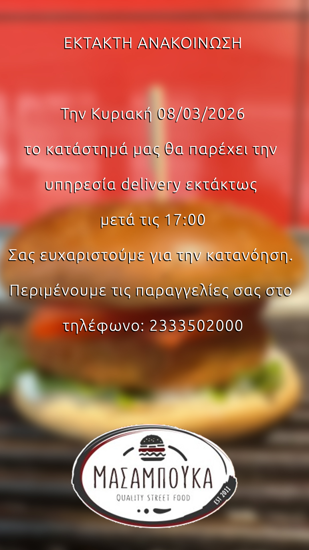 Όπως ανακοίνωσε η Διεύθυνση του ΜΑΣΑΜΠΟΥΚΑ, το delivery του μαγαζιού θα λειτουργήσει σήμερα Κυριακή 8 Μαρτίου 2026 εκτάκτως από τις 17:00
