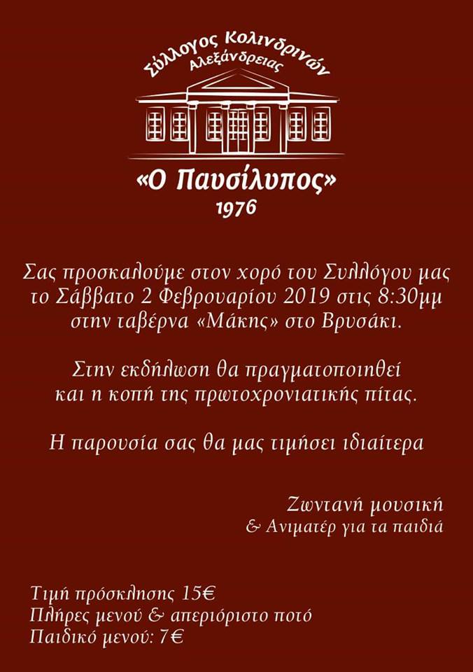 Το Σάββατο 2 Φεβρουαρίου στις 20:30 στην ταβέρνα “Μάκης” στο Βρυσάκι ο Σύλλογος Κολινδρινών Αλεξάνδρειας θα πραγματοποιήσει χορό και θα κόψει την πρωτοχρονιάτικη βασιλόπιτα.