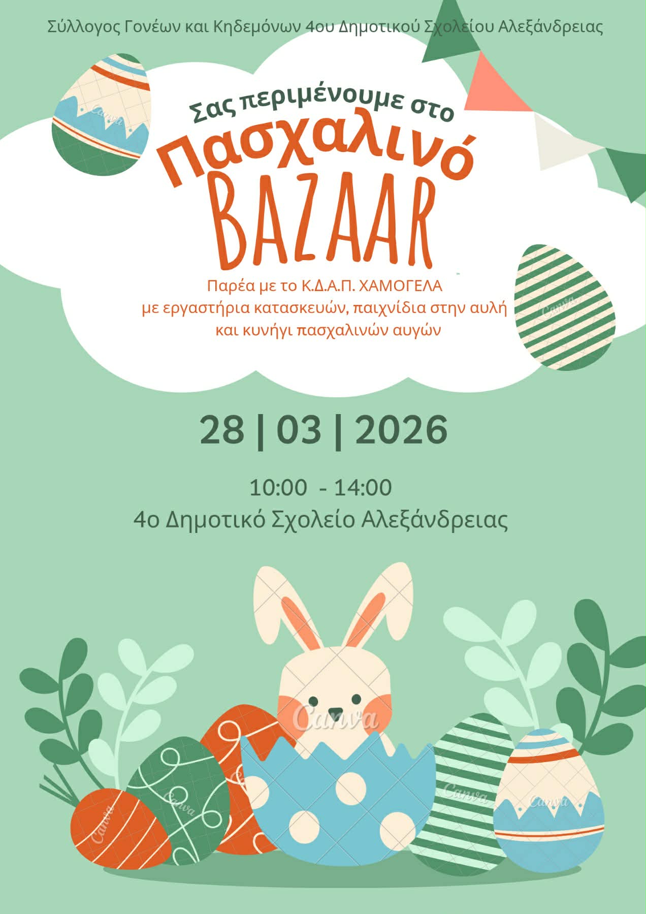 Ο Σύλλογος Γονέων και Κηδεμόνων του 4ου Δημοτικού Σχολείου Αλεξάνδρειας σας προσκαλεί στο καθιερωμένο Πασχαλινό Bazaar!