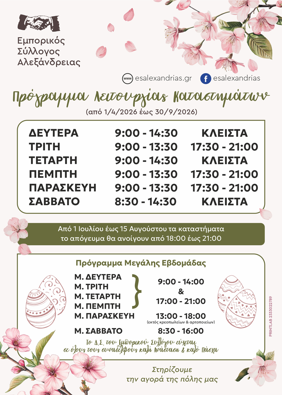 Το θερινό πρόγραμμα λειτουργίας των καταστημάτων ανακοίνωσε ο Εμπορικός Σύλλογος Αλεξάνδρειας.