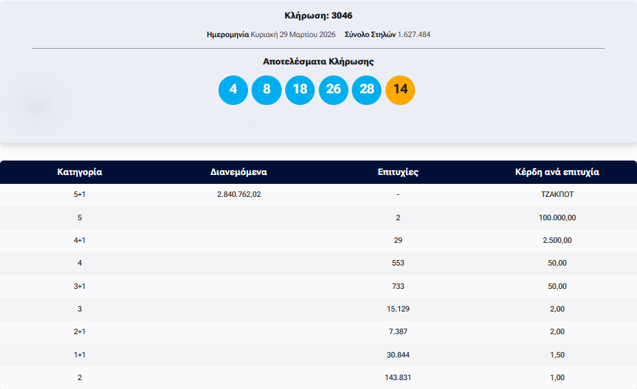 Τζακ ποτ σημειώθηκε στην κλήρωση του Τζόκερ της Κυριακής 29 Μαρτίου 2026.