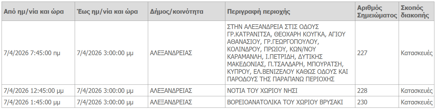 Προγραμματισμένες διακοπές ρεύματος λόγω κατασκευών θα πραγματοποιήσει την Τρίτη 7 Απριλίου 2026 ο ΔΕΔΔΗΕ στον δήμο Αλεξάνδρειας.