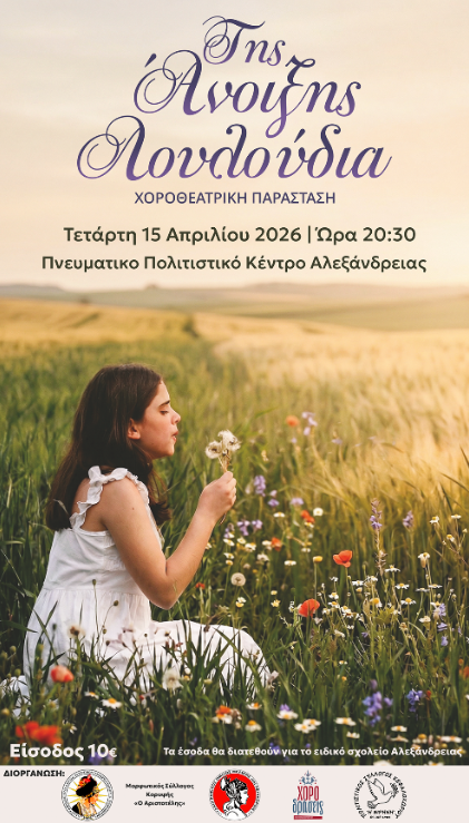 Την Τετάρτη 15 Απριλίου 2026 και ώρα 20:30, το Πνευματικό Πολιτιστικό Κέντρο Αλεξάνδρειας φιλοξενεί τη χοροθεατρική παράσταση «Της Άνοιξης Λουλούδια», μια ξεχωριστή πολιτιστική εκδήλωση αφιερωμένη στην ομορφιά και την αναγέννηση της άνοιξης.