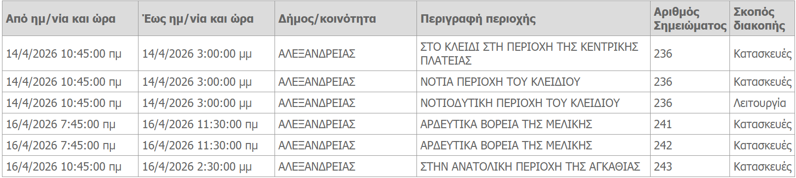 Προγραμματισμένες διακοπές ρεύματος λόγω κατασκευών θα πραγματοποιήσει από την Τρίτη 14 Απριλίου 2026 ο ΔΕΔΔΗΕ στον δήμο Αλεξάνδρειας.