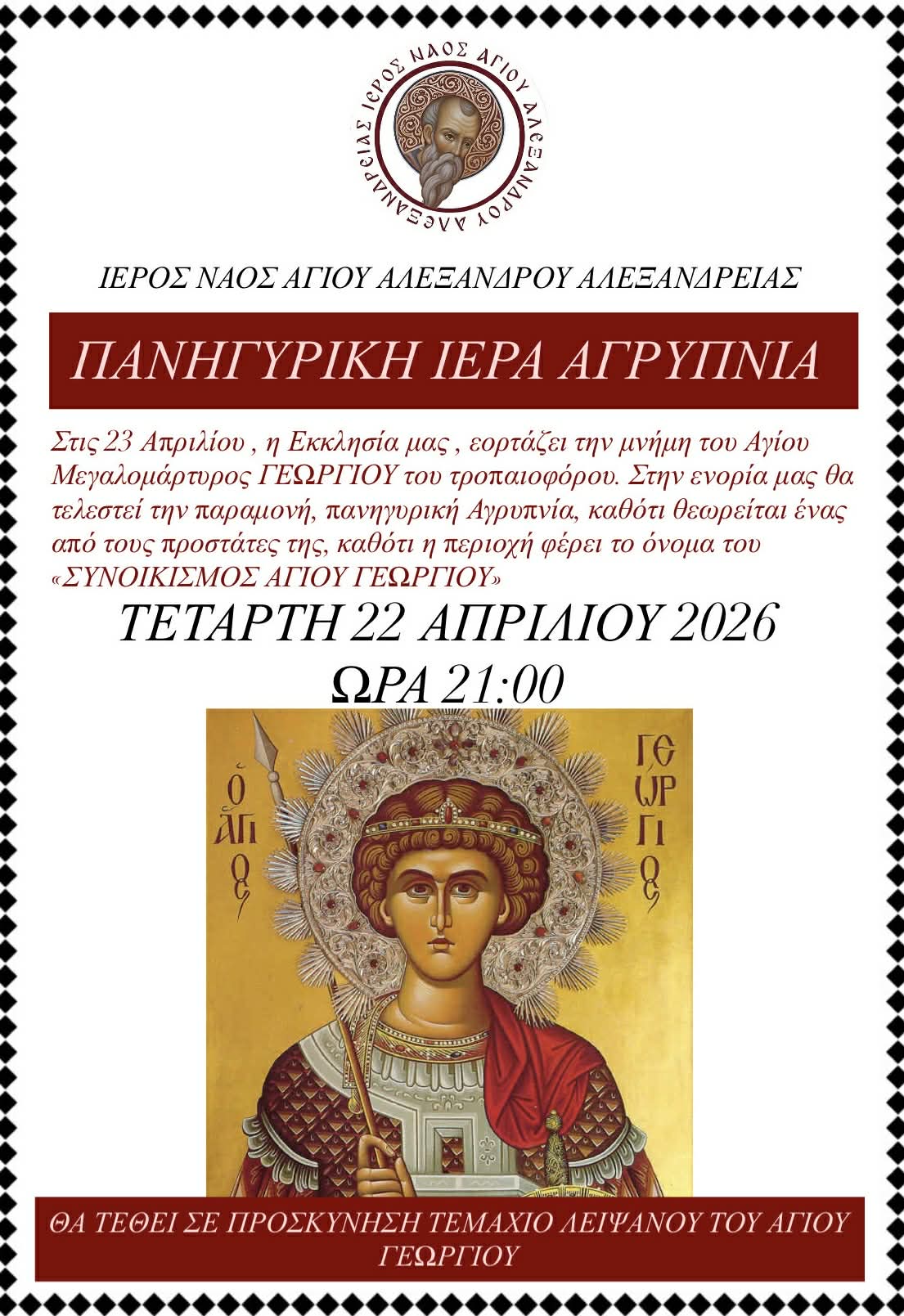 Με την ευκαιρία της εορτής του Αγίου Μεγαλομάρτυρος Γεωργίου του Τροπαιοφόρου στις 23 Απριλίου, ο Ιερός Ναός Αγίου Αλεξάνδρου Αλεξάνδρειας προσκαλεί τους πιστούς στην Πανηγυρική Ιερά Αγρυπνία που θα τελεστεί την παραμονή της εορτής.