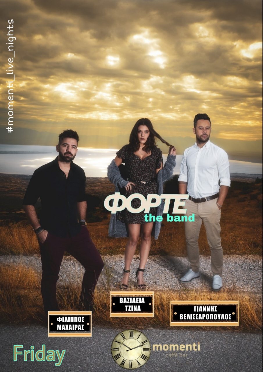 Οι Φόρτε- the band που αποτελούνται από τους Γιάννη Βελισσαρόπουλο, Βασιλεία Τζίνα και Φίλιππο Μαχαίρα, επιστρέφουν στο momenti και υπόσχονται ένα δυνατό βράδυ Παρασκευής με Ελληνικά 90s, ποπ, και εμπορικά κομμάτια!