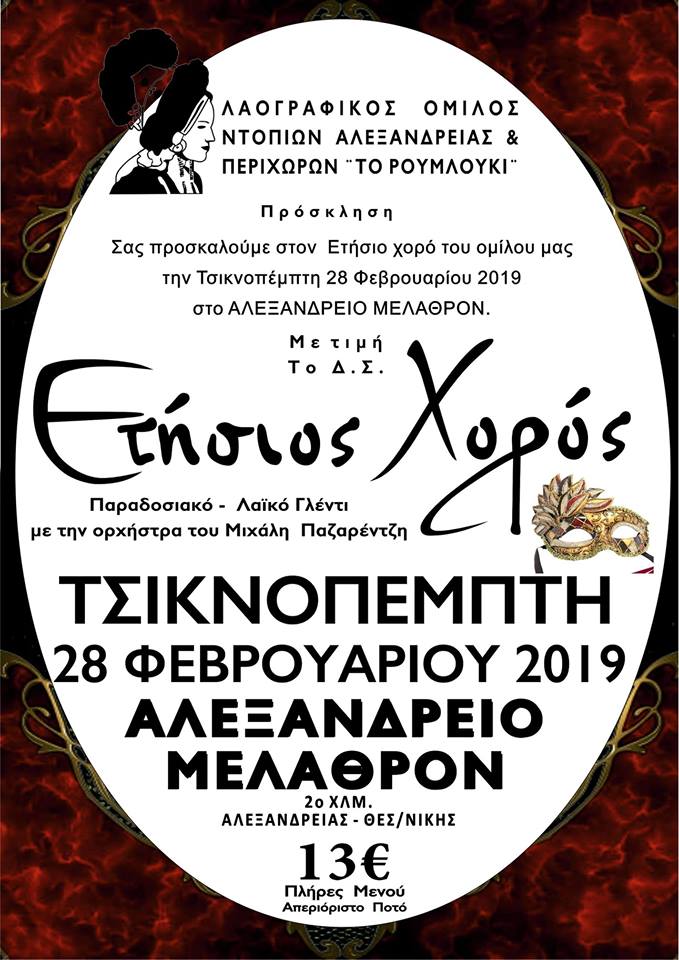 Ο Λαογραφικός Όμιλος Ντόπιων Αλεξάνδρειας και περιχώρων “Το Ρουμλούκι” σας προσκαλεί στον Ετήσιο Χορό του την Τσικνοπέμπτη 28 Φεβρουαρίου στο ΑΛΕΞΑΝΔΡΕΙΟ ΜΕΛΑΘΡΟΝ.