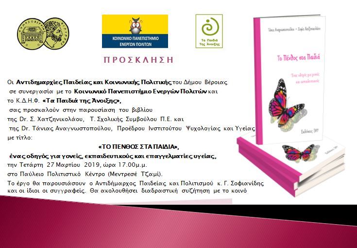 Οι Αντιδημαρχίες Παιδείας και Κοινωνικής Πολιτικής του Δήμου Βέροιας σε συνεργασία με το Κοινωνικό Πανεπιστήμιο Ενεργών Πολιτών και το Κ.Δ.Η.Φ. «Τα Παιδιά της Άνοιξης», σας προσκαλούν στην παρουσίαση του βιβλίου της Dr. Σ. Χατζηνικολάου, Τ. Σχολικής Συμβούλου Π.Ε. και της Dr. Τάνιας Αναγνωστοπούλου, Προέδρου Ινστιτούτου Ψυχολογίας και Υγείας με τίτλο: