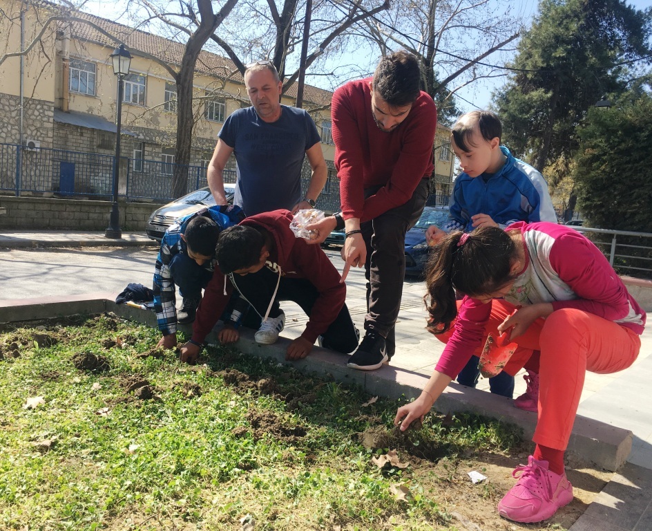 Στη συνέχεια, τους δόθηκαν οι βολβοί και με χαρά και κέφι μικροί και μεγάλοι τους πέταξαν μέσα στις τρύπες. Έπειτα, έκλεισαν τις τρύπες περιμένοντας να ανθίσουν τα χρωματιστά λουλούδια. Γιατί… όπως γράφει κι ο Οδυσσέας Ελύτης: «Την Άνοιξη αν δεν τη βρεις, τη φτιάχνεις…».