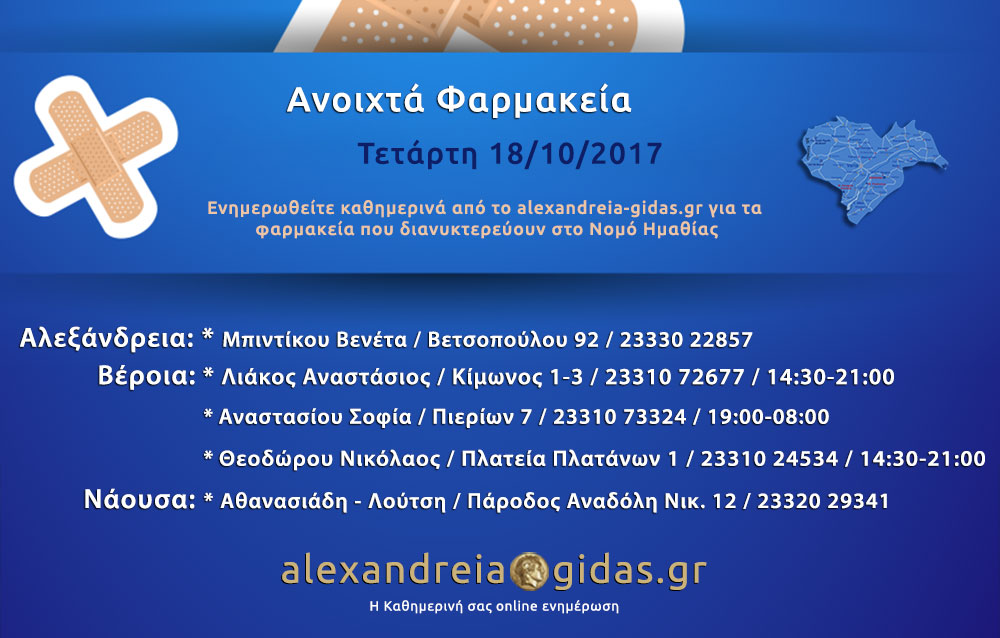 ΤΟΠΙΚΑ 18 Οκτωβρίου, 2017 posted by admin Share Ανοιχτά φαρμακεία Αλεξάνδρειας και εφημερεύοντα – διανυκτερεύοντα Ημαθίας Τετάρτη 18 Οκτωβρίου Αλεξάνδρεια: Αφήστε μια απάντηση Ακύρωση απάντησηςΗ ηλ. διεύθυνση σας δεν δημοσιεύεται. Τα υποχρεωτικά πεδία σημειώνονται με *Σχόλιο * Όνομα Email Ιστότοπος Αποθήκευσε το όνομά μου, email, και τον ιστότοπο μου σε αυτόν τον πλοηγό για την επόμενη φορά που θα σχολιάσω.