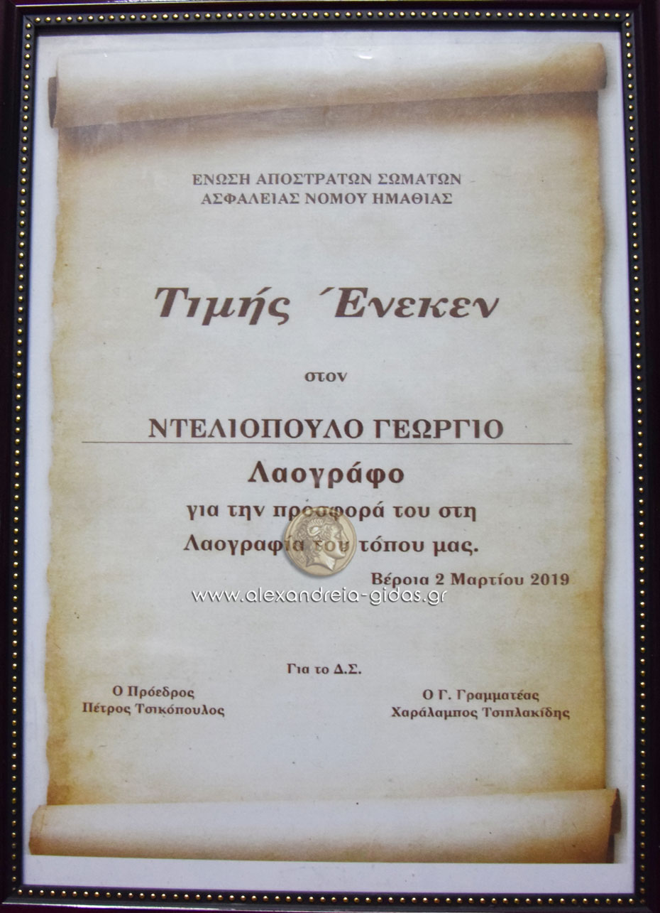 Θέλω να ευχαριστήσω μέσα από τα βάθη της ψυχής μου την ΕΝΩΣΗ ΑΠΟΣΤΡΑΤΩΝ ΑΣΦΑΛΕΙΑΣ ΝΟΜΟΥ ΗΜΑΘΙΑΣ για την μεγάλη τιμή που μου έκαναν να αναγνωρίσουν το πολύχρονο έργο μου στο χώρο της Λαογραφίας και ιστορίας στον τόπο μας.