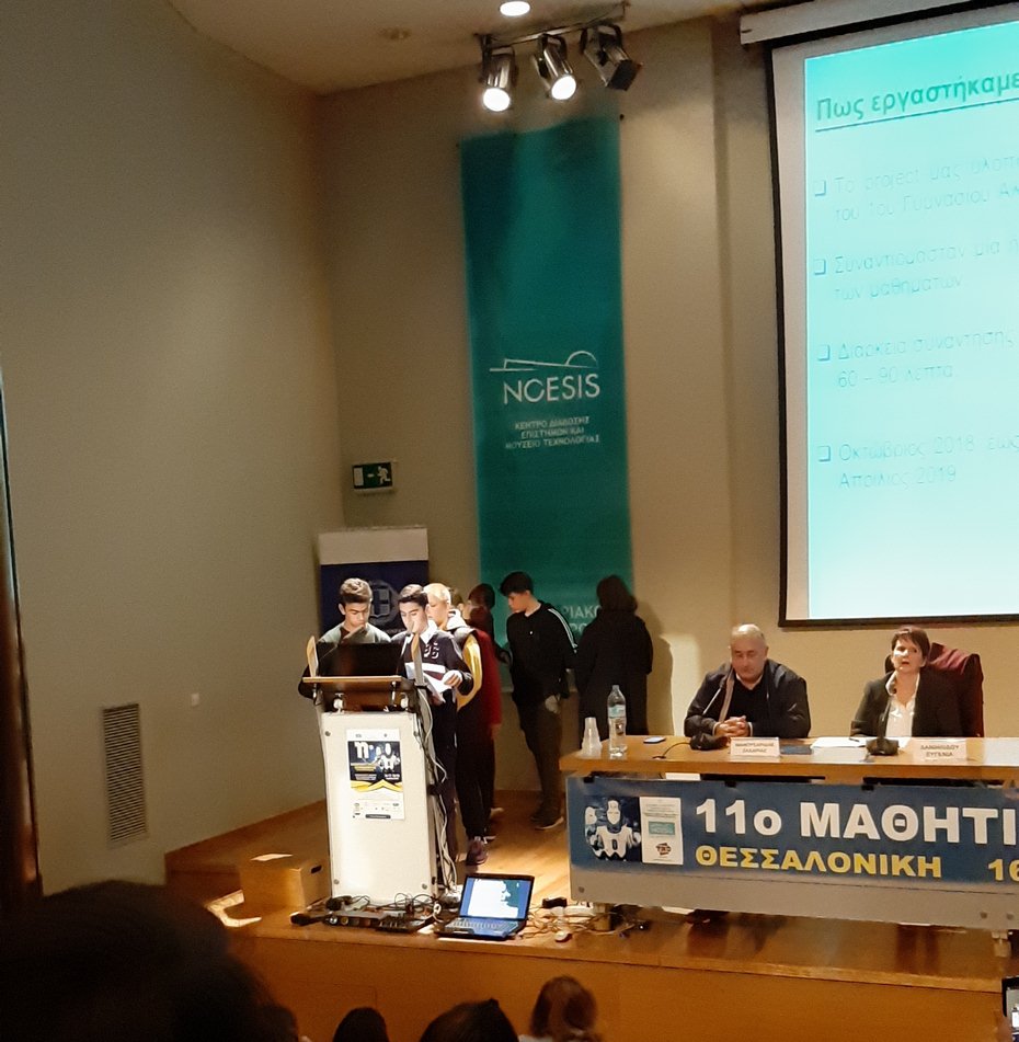 Δυναμική παρουσίαση του 1ου Γυμνασίου Αλεξάνδρειας στο 11ο Μαθητικό Συνέδριο Πληροφορικής στο Κέντρο Διάδοσης Επιστημών και Μουσείο Τεχνολογίας «Νόησις» το οποίο διεξήχθη από 16 μέχρι 19 Απριλίου 2019.