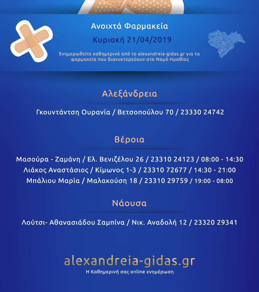 Ανοιχτά φαρμακεία Ημαθίας Κυριακή 21 Απριλίου