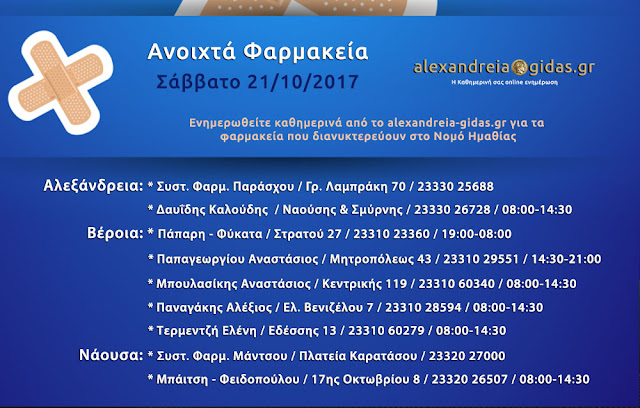 ΤΟΠΙΚΑ 21 Οκτωβρίου, 2017 posted by admin Share Ανοιχτά φαρμακεία Ημαθίας Σάββατο 21 Οκτωβρίου Αλεξάνδρεια: Αφήστε μια απάντηση Ακύρωση απάντησηςΗ ηλ. διεύθυνση σας δεν δημοσιεύεται. Τα υποχρεωτικά πεδία σημειώνονται με *Σχόλιο * Όνομα Email Ιστότοπος Αποθήκευσε το όνομά μου, email, και τον ιστότοπο μου σε αυτόν τον πλοηγό για την επόμενη φορά που θα σχολιάσω.