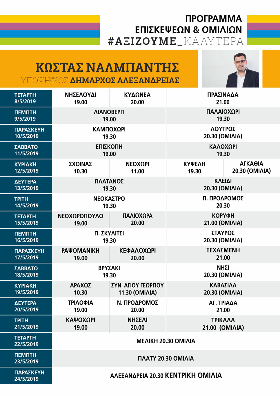 Το πρόγραμμα των ομιλιών του υποψήφιου δημάρχου Αλεξάνδρειας Κώστα Ναλμπάντη ανακοίνωσε ο συνδυασμός “Αξίζουμε καλύτερα”.