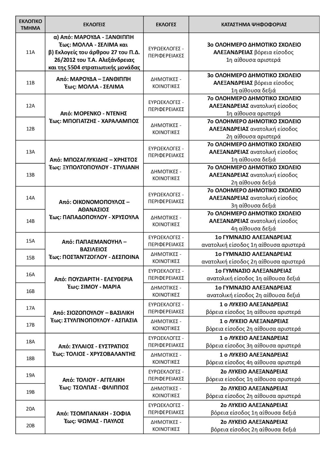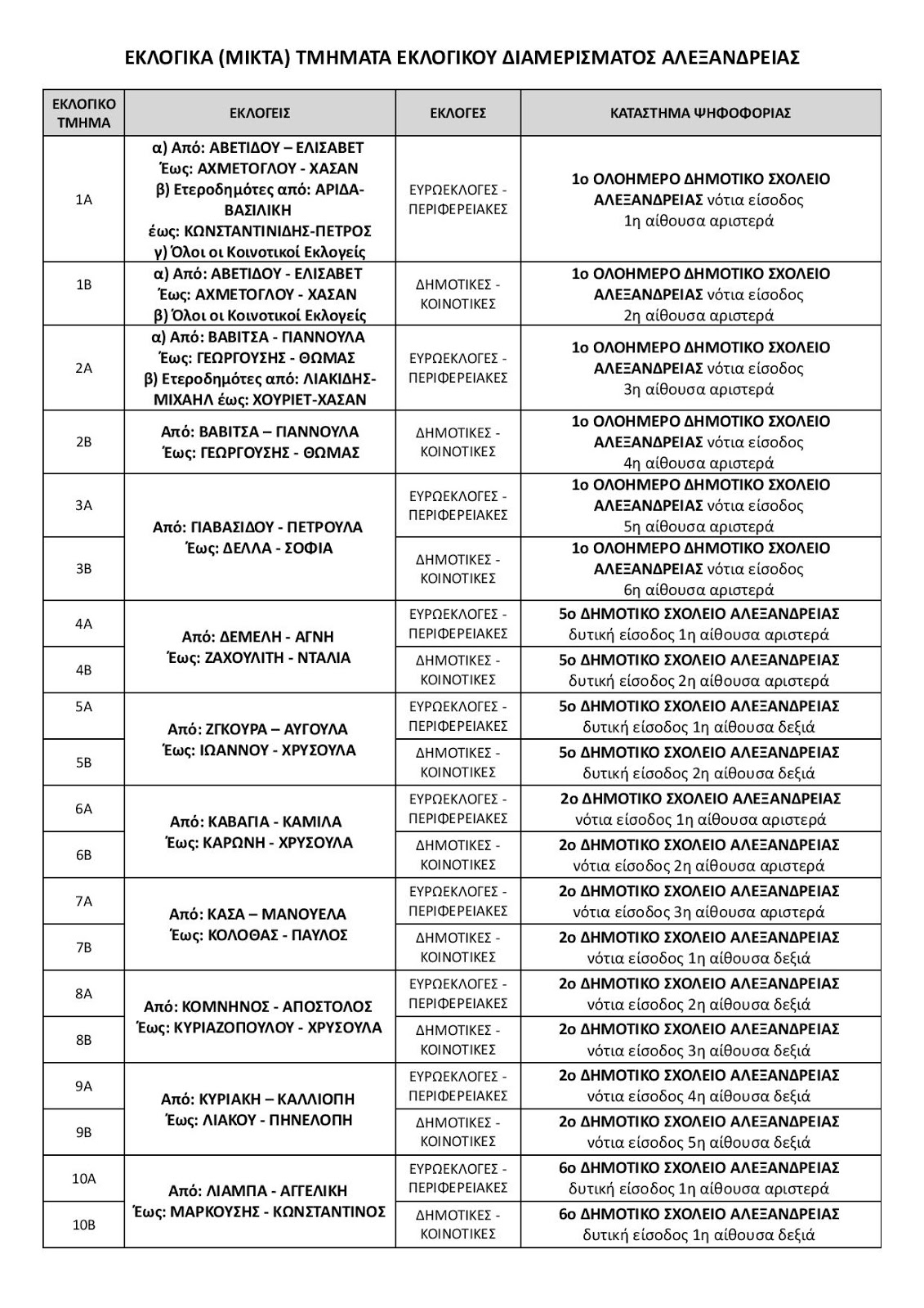 Οι εκλογείς του Εκλογικού Διαμερίσματος Αλεξάνδρειας μπορούν να ενημερωθούν σε ποιο Εκλογικό τμήμα ψηφίζουν βλέποντας τον παρακάτω πίνακα: