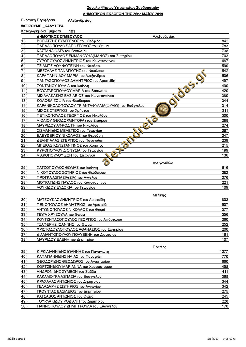 Δείτε παρακάτω τα ΕΠΙΣΗΜΑ αποτελέσματα των πέντε συνδυασμών του δήμου Αλεξάνδρειας: