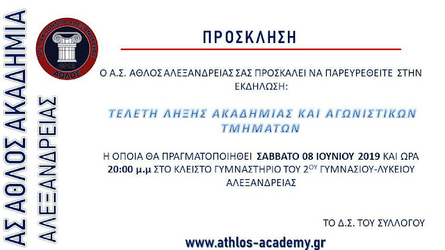 Η εκδήλωση θα πραγματοποιηθεί το Σάββατο 8 Ιουνίου 2019 στις 20:00 στο κλειστό γυμναστήριο του 2ου Γυμνασίου – Λυκείου Αλεξάνδρειας.