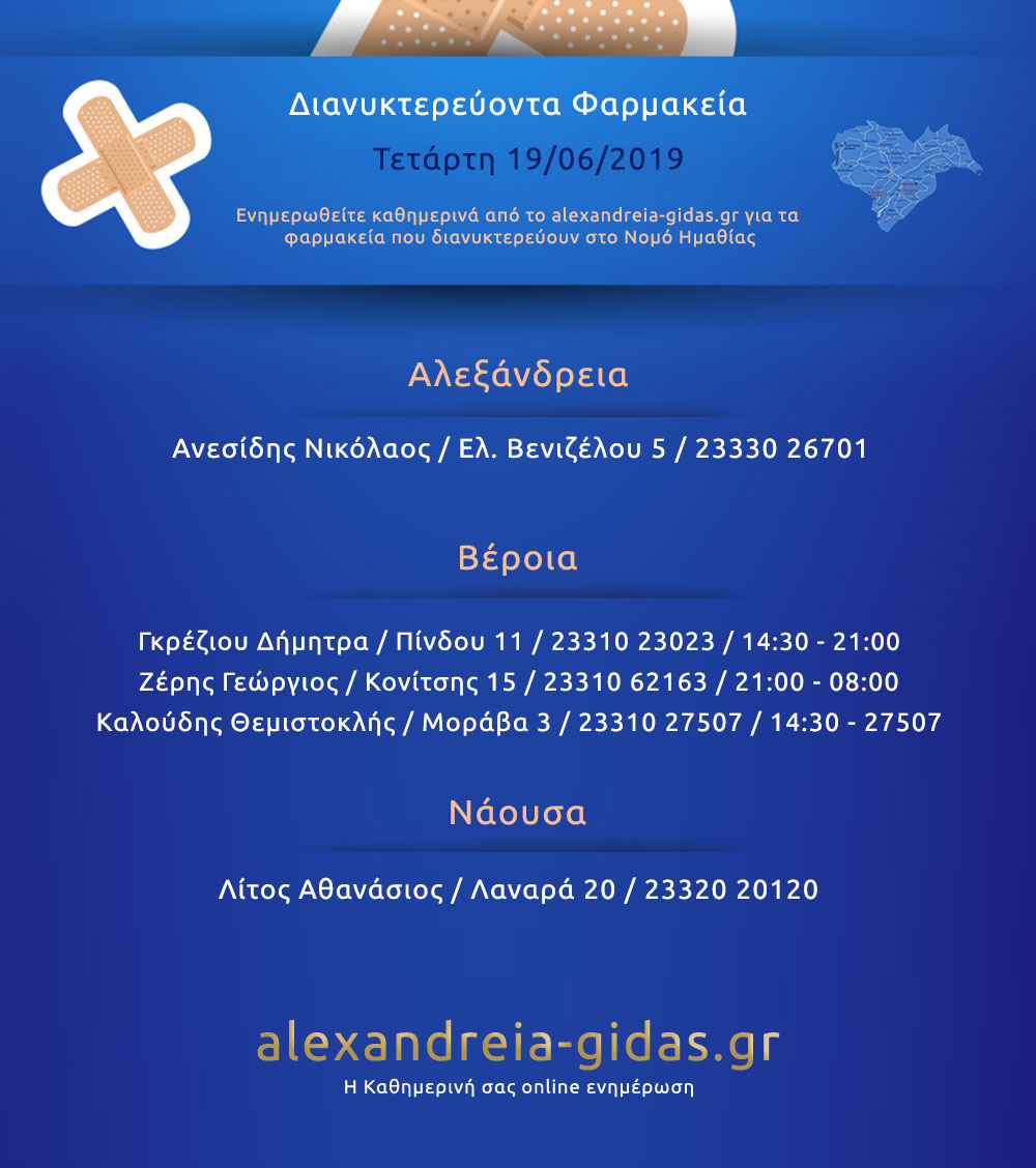 ΤΟΠΙΚΑ 19 Ιουνίου, 2019 posted by admin Share Εφημερεύοντα – διανυκτερεύοντα φαρμακεία Ημαθίας Τετάρτη 19 Ιουνίου Αλεξάνδρεια: Αφήστε μια απάντηση Ακύρωση απάντησηςΗ ηλ. διεύθυνση σας δεν δημοσιεύεται. Τα υποχρεωτικά πεδία σημειώνονται με *Σχόλιο * Όνομα Email Ιστότοπος Αποθήκευσε το όνομά μου, email, και τον ιστότοπο μου σε αυτόν τον πλοηγό για την επόμενη φορά που θα σχολιάσω.