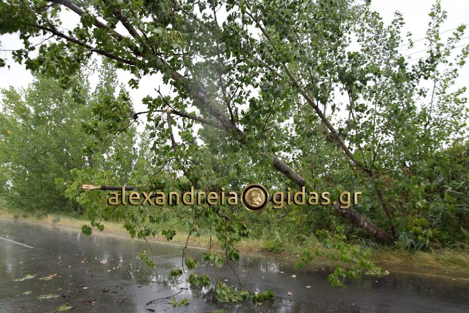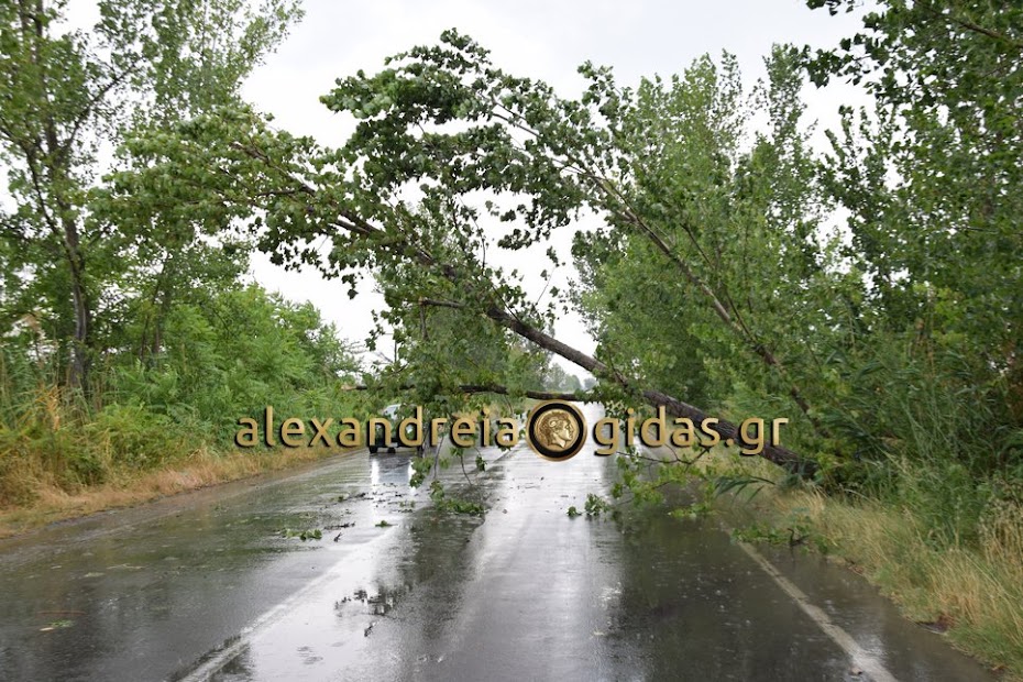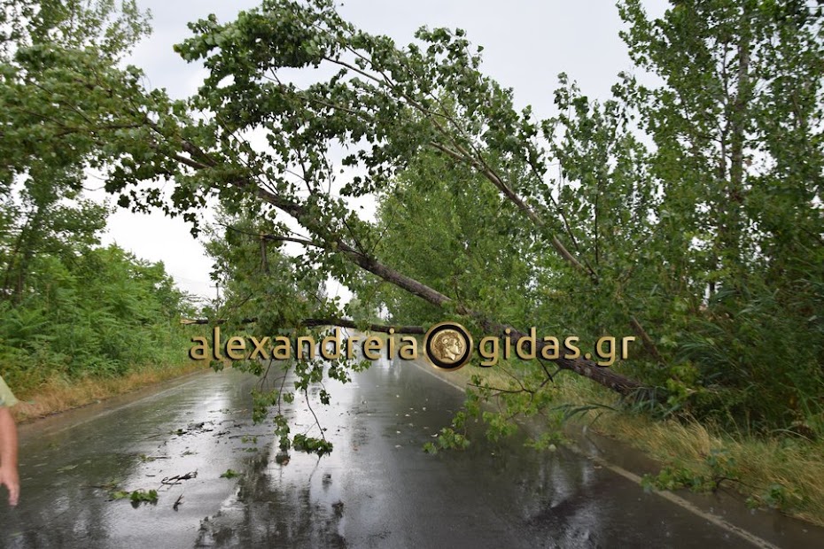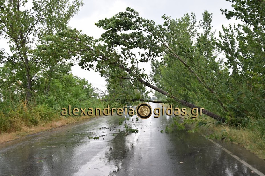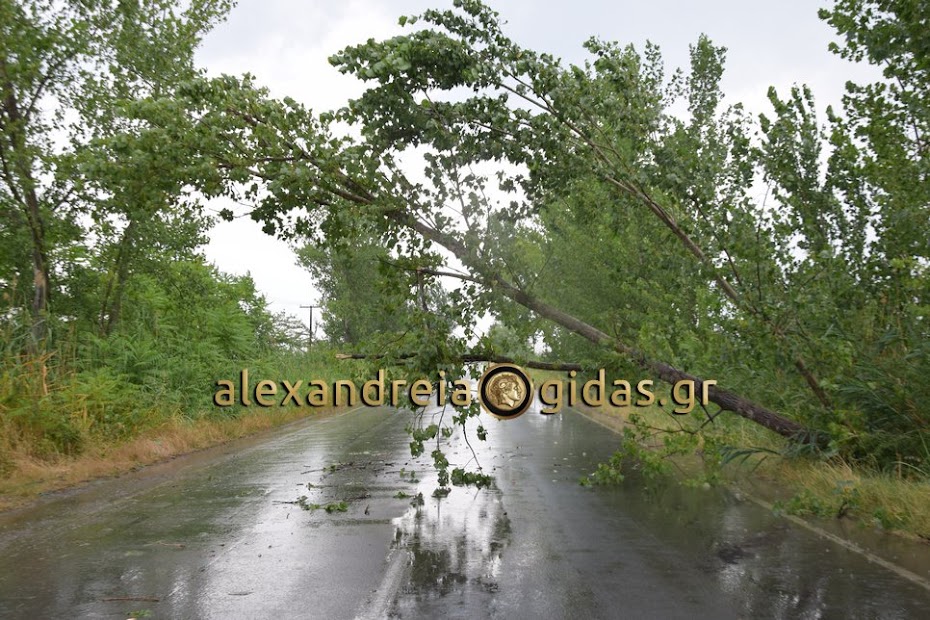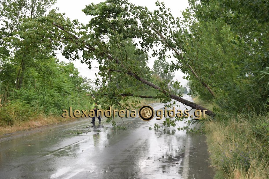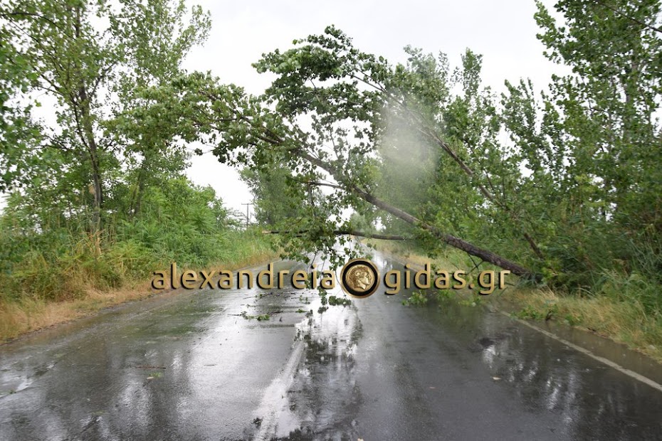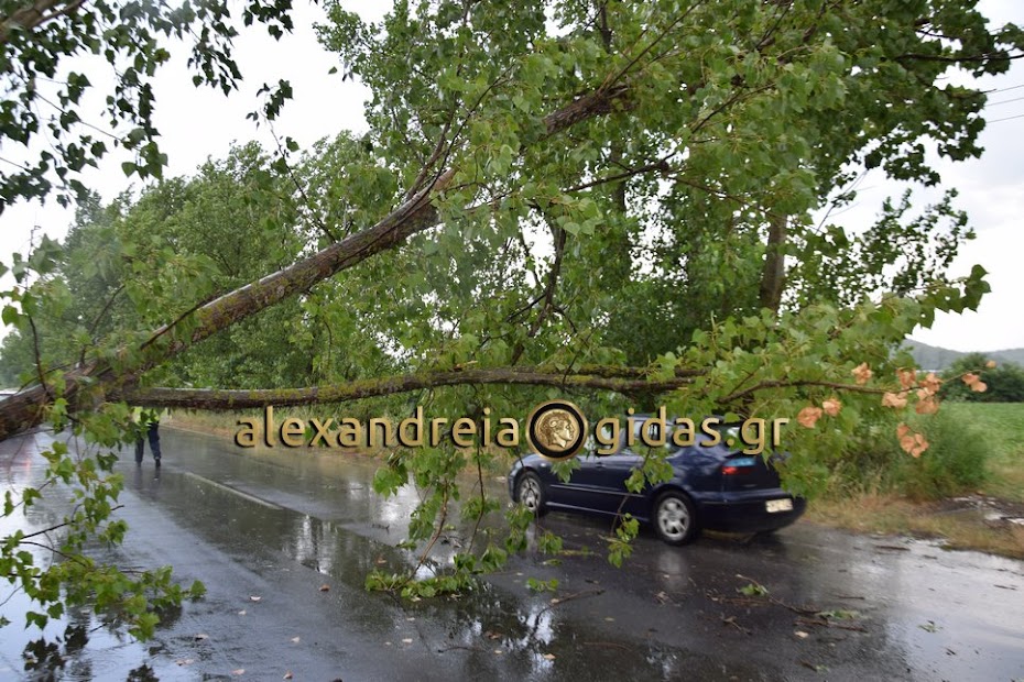 Ο δυνατός αέρας έριξε δέντρο λίγο πριν την είσοδο της Κυψέλης του δήμου Αλεξάνδρειας το απόγευμα της σημερινής Δευτέρας 24 Ιουνίου 2019.