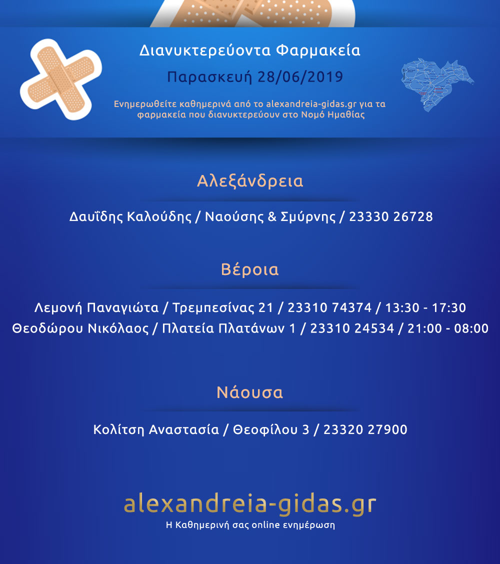 ΤΟΠΙΚΑ 28 Ιουνίου, 2019 posted by admin Share Εφημερεύοντα – διανυκτερεύοντα φαρμακεία Ημαθίας Παρασκευή 28 Ιουνίου 2019 Αλεξάνδρεια: Αφήστε μια απάντηση Ακύρωση απάντησηςΗ ηλ. διεύθυνση σας δεν δημοσιεύεται. Τα υποχρεωτικά πεδία σημειώνονται με *Σχόλιο * Όνομα Email Ιστότοπος Αποθήκευσε το όνομά μου, email, και τον ιστότοπο μου σε αυτόν τον πλοηγό για την επόμενη φορά που θα σχολιάσω.