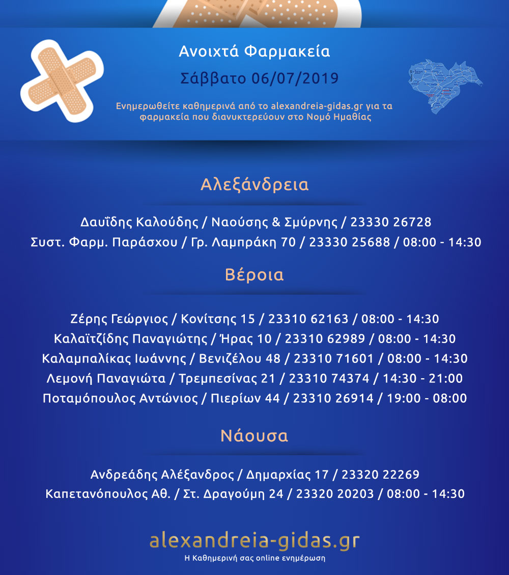 Ανοιχτά φαρμακεία Ημαθίας Σάββατο 6 Ιουλίου