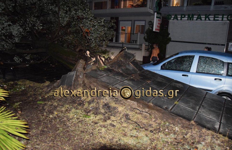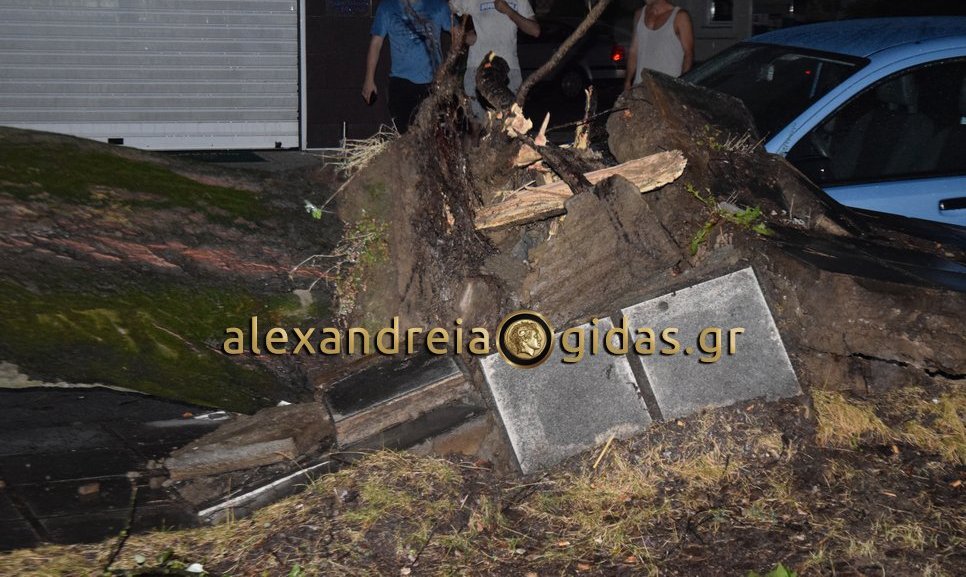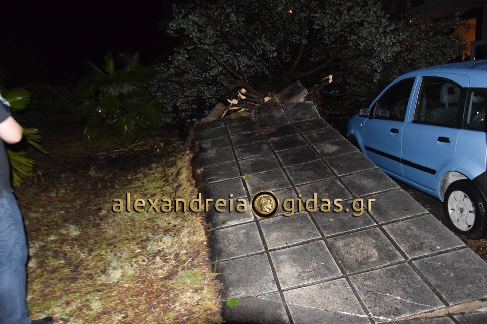 Ο δυνατός αέρας έριξε δύο μεγάλα δέντρα τα οποία ξήλωσαν το πεζοδρόμιο και καταπλάκωσαν σταθμευμένα αυτοκίνητα.