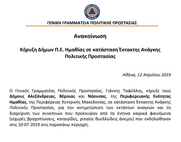 Ο Γενικός Γραμματέας Πολιτικής Προστασίας, Γιάννης Ταφύλλης, με απόφασή του σήμερα το μεσημέρι, κήρυξε τους Δήμους Αλεξάνδρειας, Βέροιας και Νάουσας, της Περιφερειακής Ενότητας Ημαθίας, της Περιφέρειας Κεντρικής Μακεδονίας, σε κατάσταση Έκτακτης Ανάγκης Πολιτικής Προστασίας, για την αντιμετώπιση των εκτάκτων αναγκών και τη διαχείριση των συνεπειών που προέκυψαν από τα έντονα καιρικά φαινόμενα (ισχυρές βροχοπτώσεις, καταιγίδες, ριπαίοι θυελλώδεις άνεμοι) που εκδηλώθηκαν στις 10-07-2019 στις παραπάνω περιοχές.
