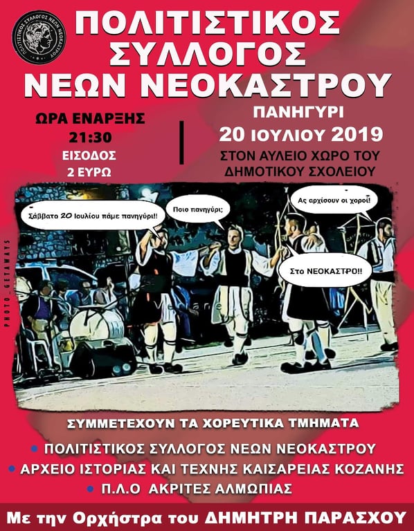 Ο Πολιτιστικός Σύλλογος Νέων Νεοκάστρου σας προσκαλεί το Σάββατο 20 Ιουλίου στο πανηγύρι του χωριού τους.