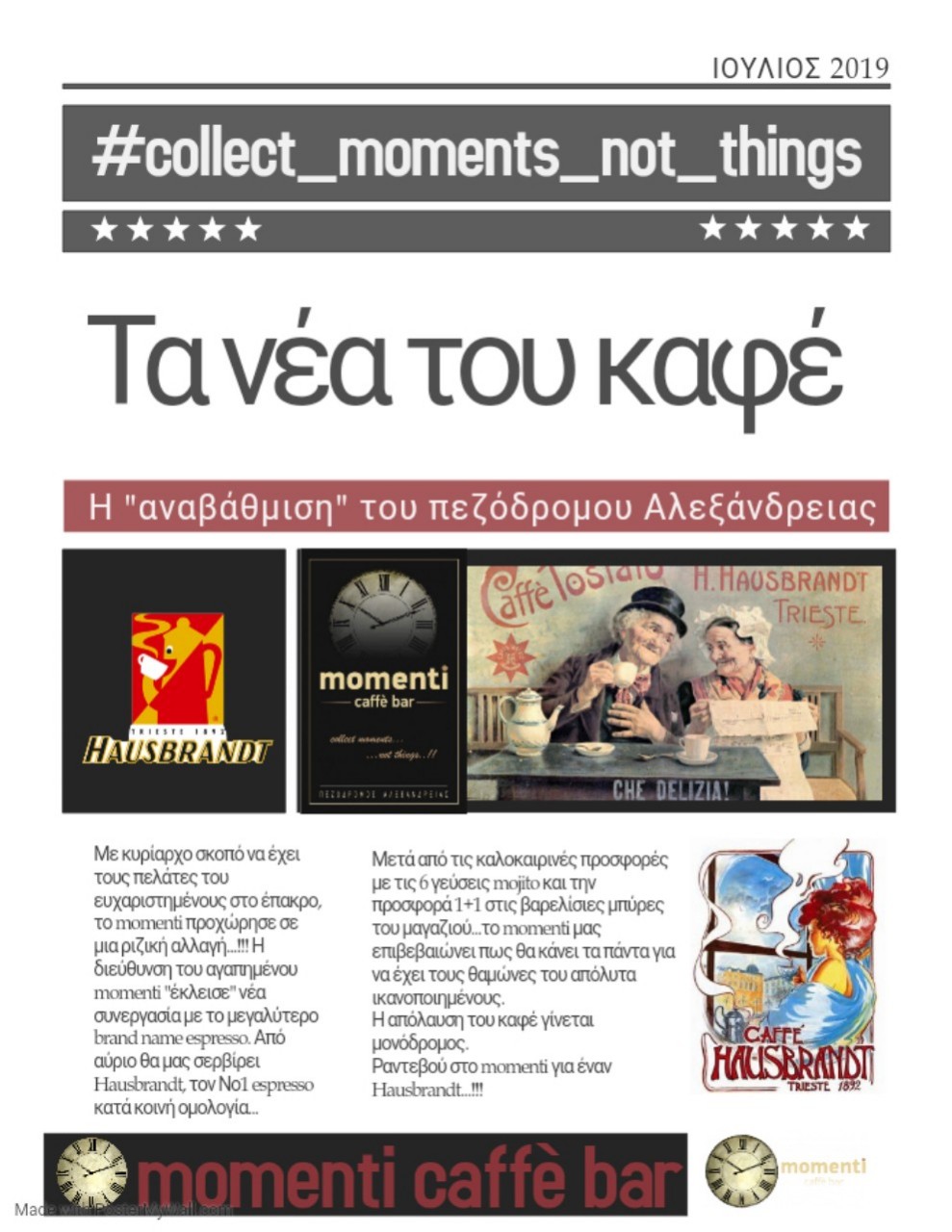 Σε συνέχεια των έξυπνων και εντυπωσιακών αφισών-banner του momenti….κυκλοφόρησε σήμερα πρωτοσέλιδο που ανακοινώνει την νέα συνεργασία του γνωστού καφέ του πεζόδρομου με τον No1, κατά κοινή ομολογία, espresso καφέ που κυκλοφορεί στην χώρα μας.